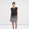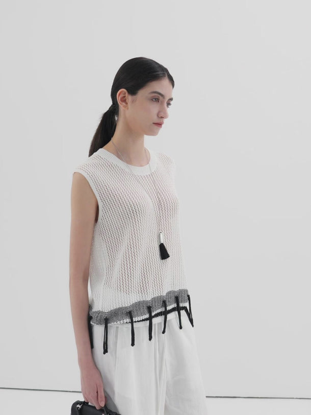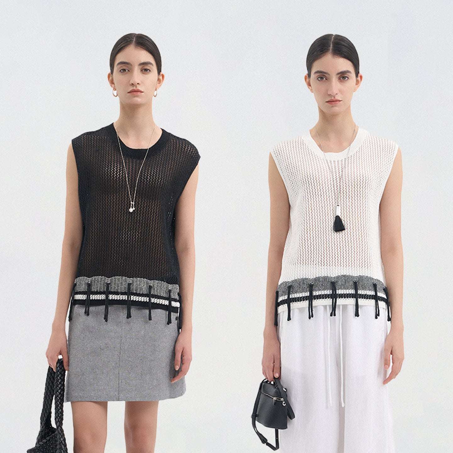 A clean crew neck knit vest silhouette frames the neckline, while the woven hem trim and black fringe accents add striking contrast. The thoughtful detailing transforms this minimalist knit into a refined yet relaxed statement piece.