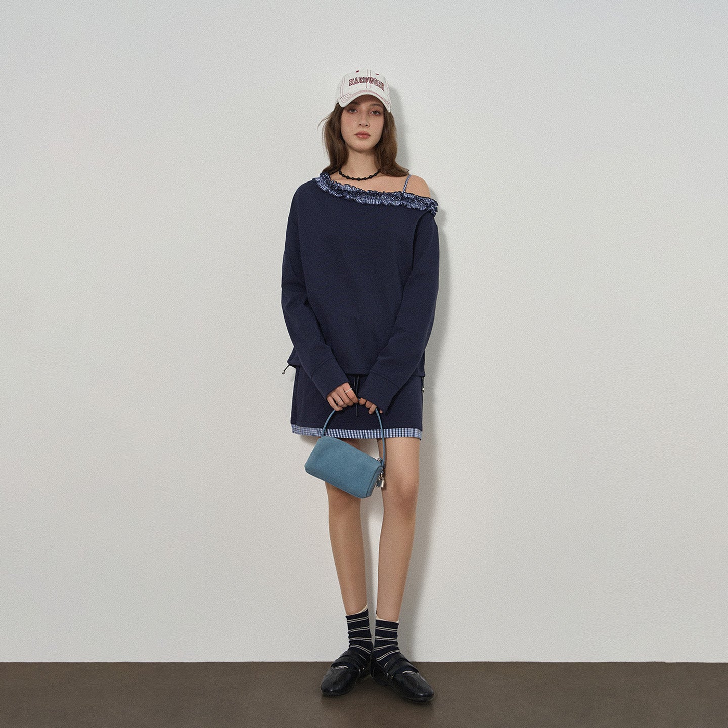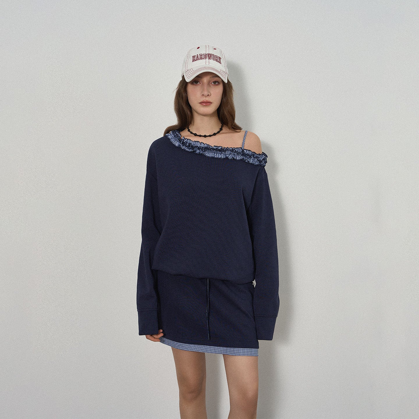 Chic Off-Shoulder Casual Set with Navy Plaid Lace Trim