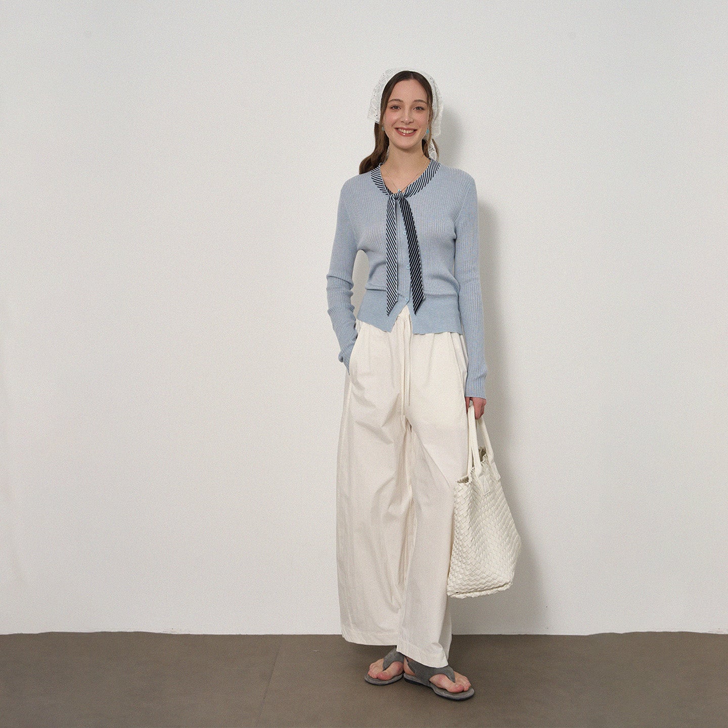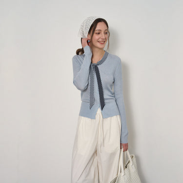 Striped Tie-Decorated Ribbed Sweater