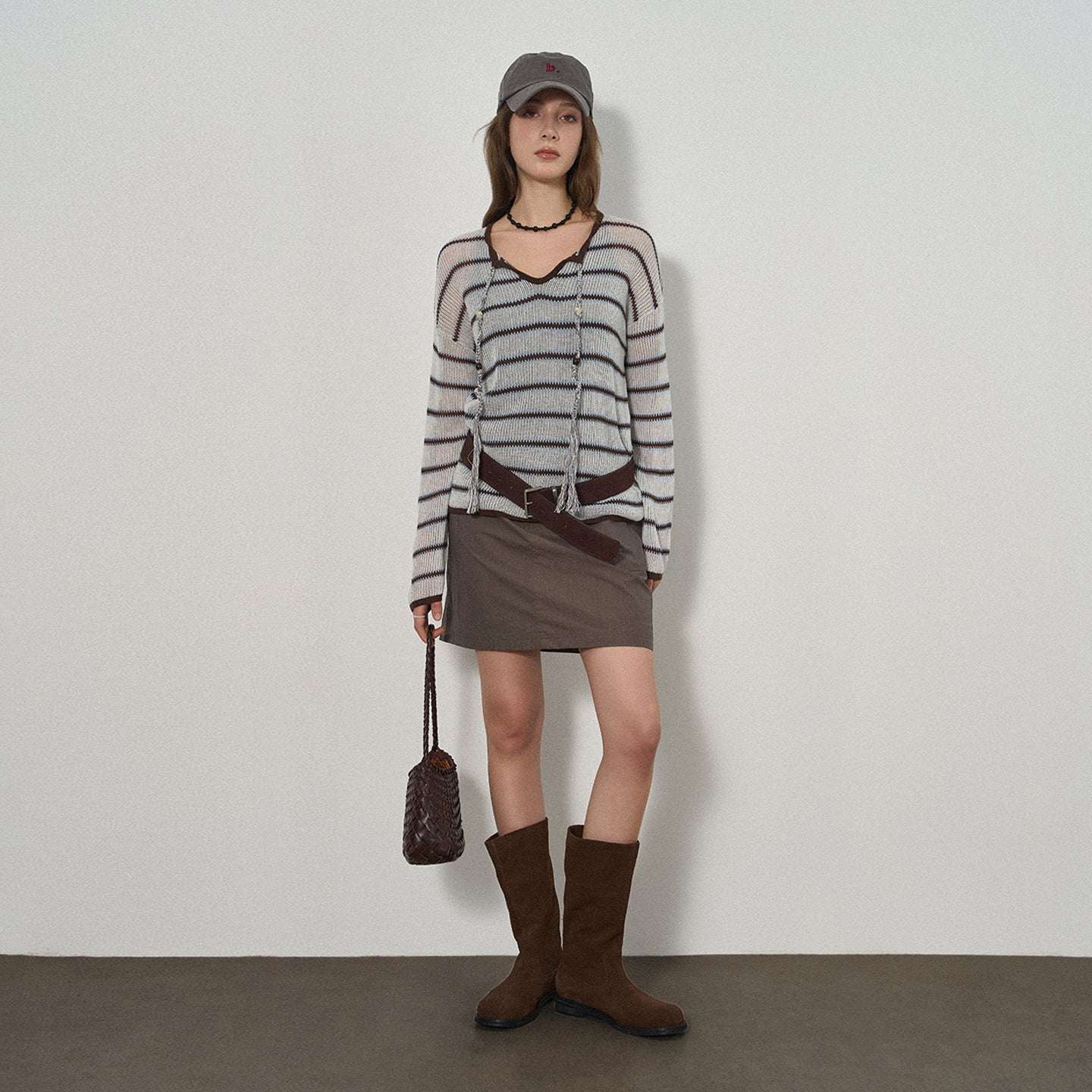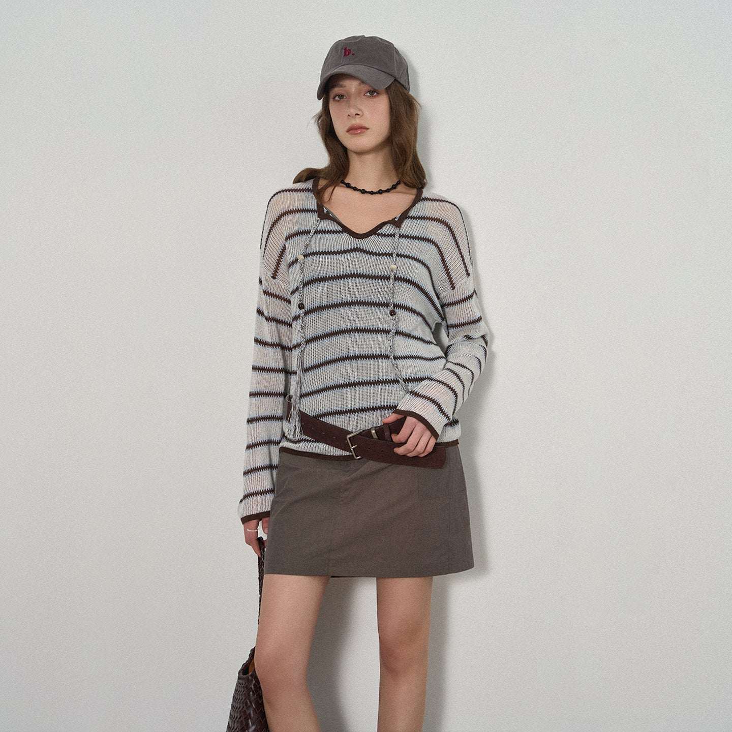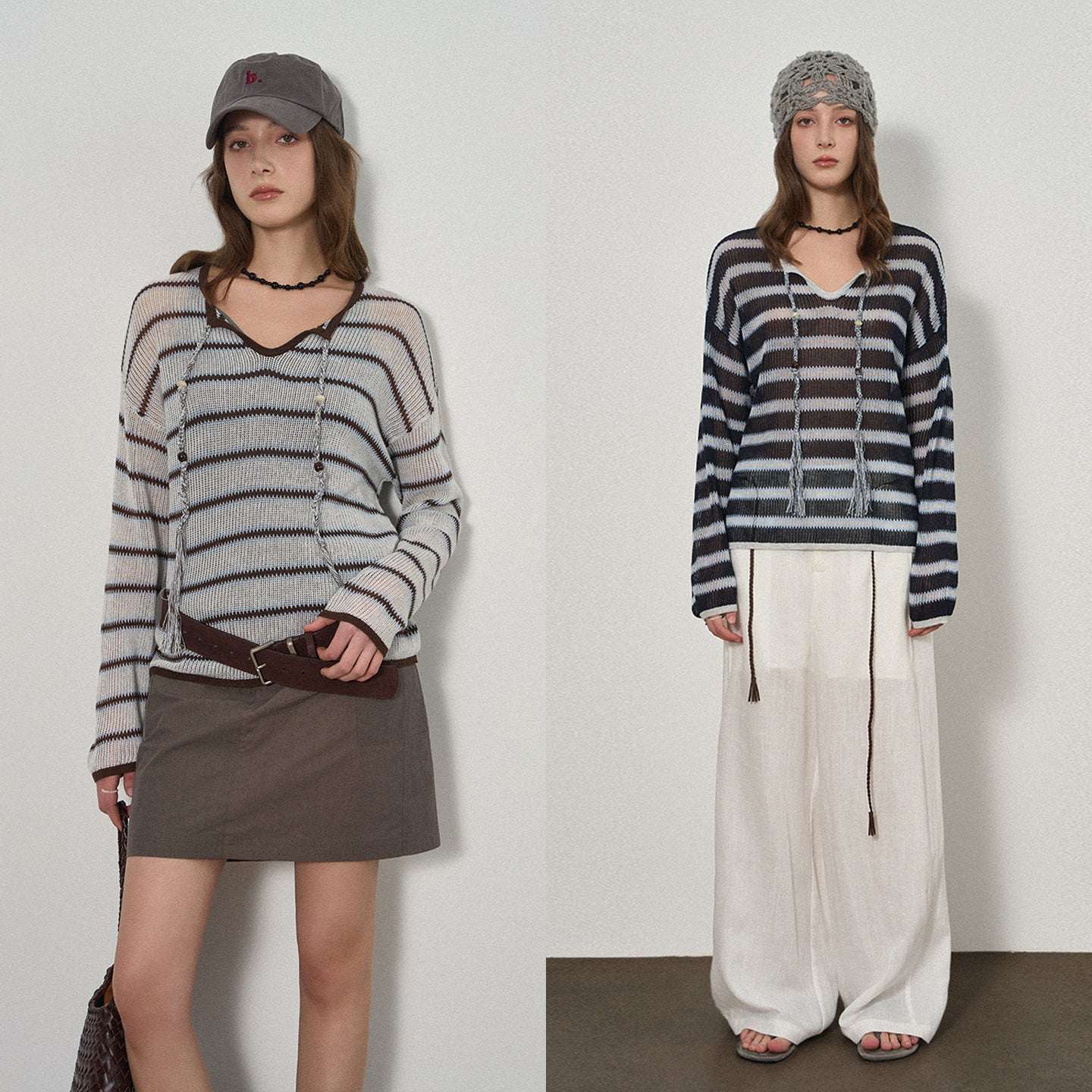 This striped drawstring fringe sweater channels a bold 90s retro mood with contrasting stripes and a relaxed V-neck drawstring design that feels carefree and expressive.