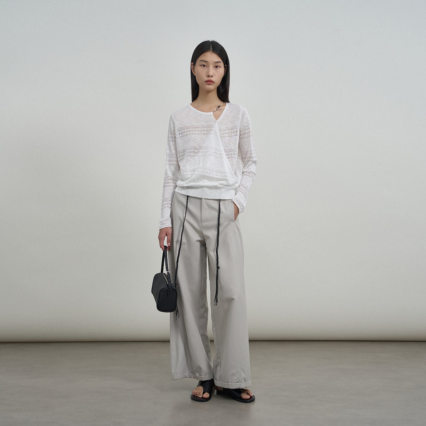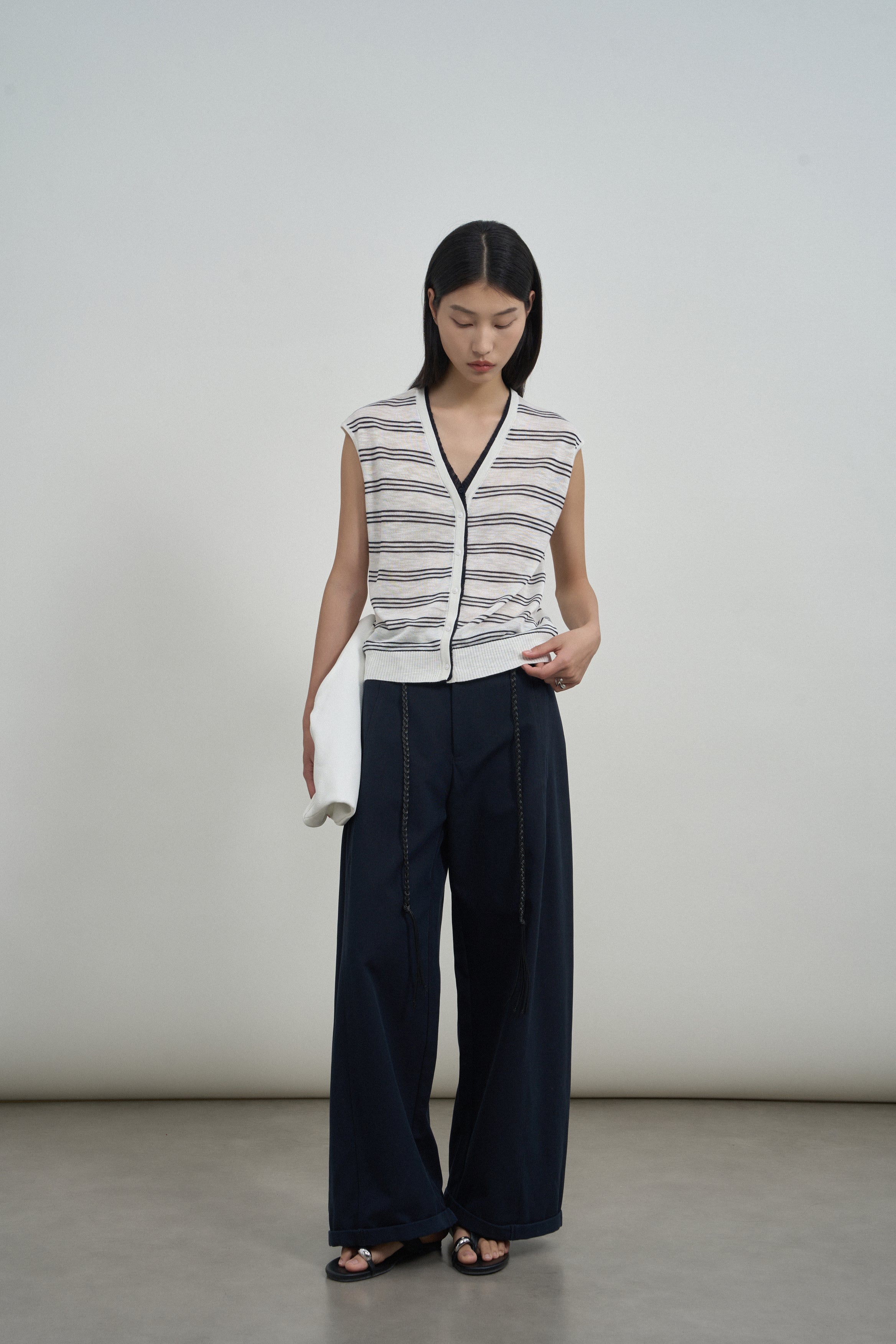 Braided side drawstrings and rolled hems add relaxed character, making these trousers perfect for commutes or off-duty days with minimalist sophistication.