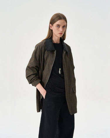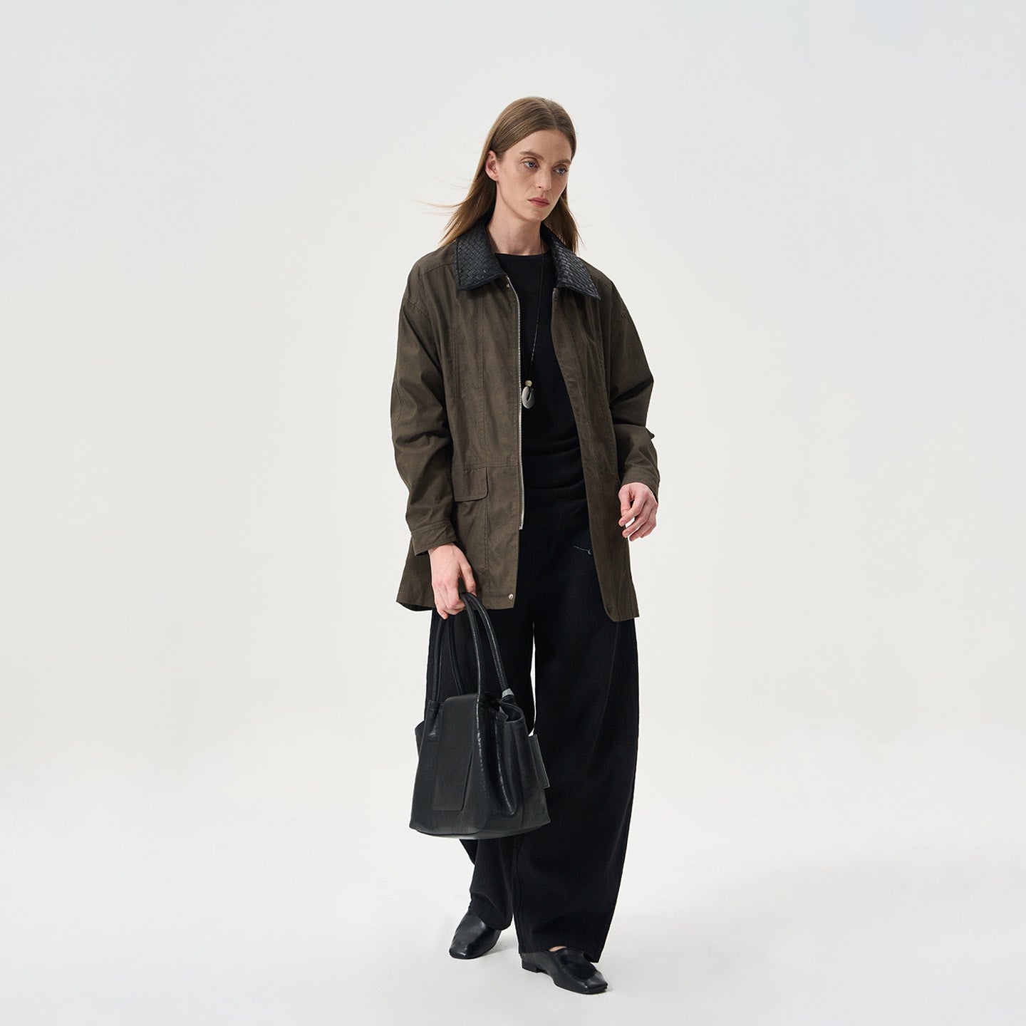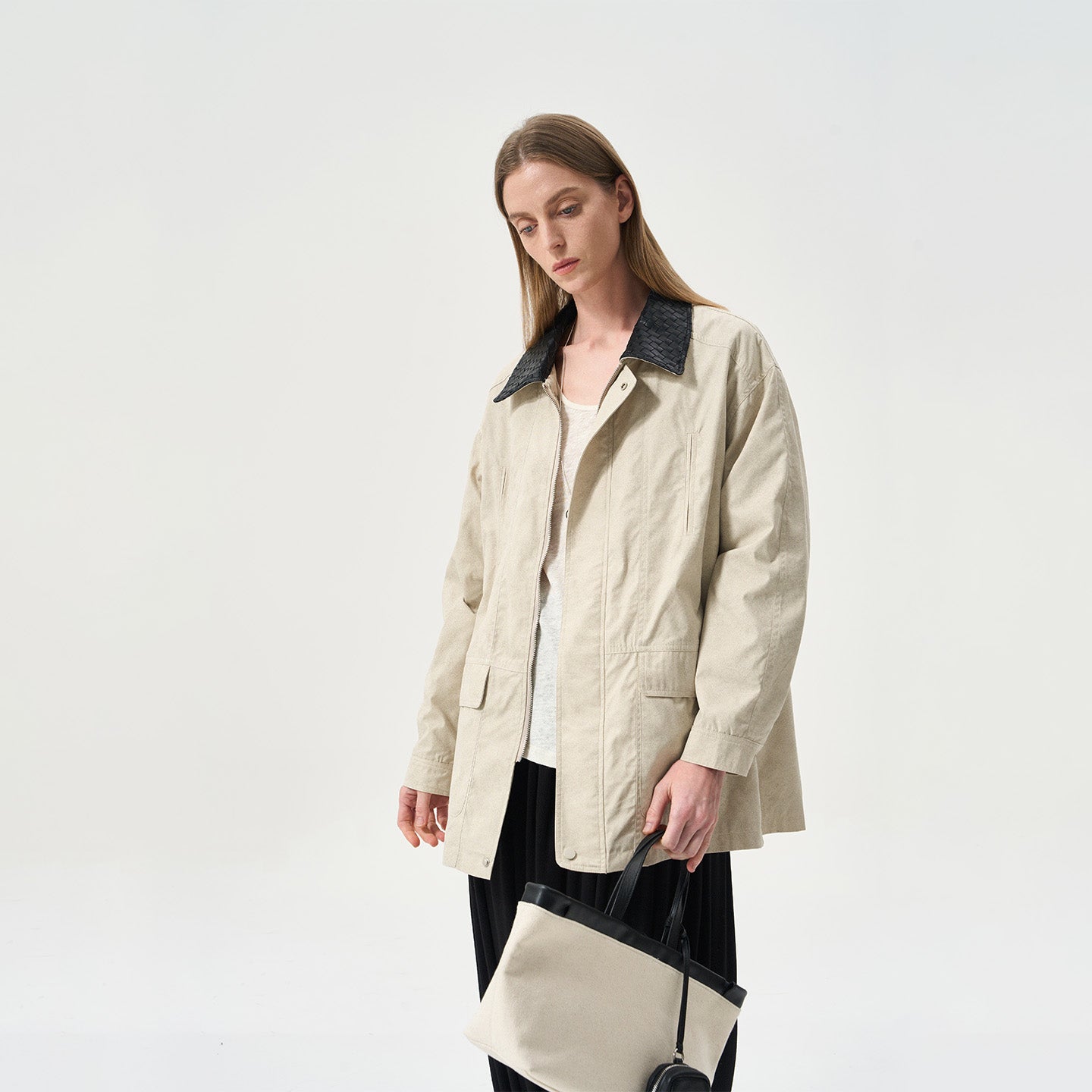 This Barn-style patchwork leather collar jacket features a textured woven leather collar, creating a unique, retro-inspired aesthetic that stands out from basic styles.