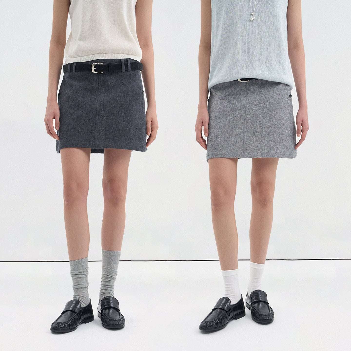 Designed to elongate the legs and slim the hips, the structured A-line cut suits a variety of body types. A black leather belt with metal buckle adds a polished touch, elevating this minimalist wardrobe staple.