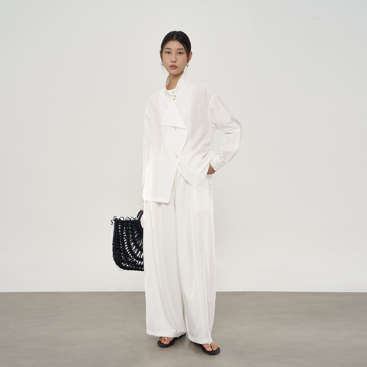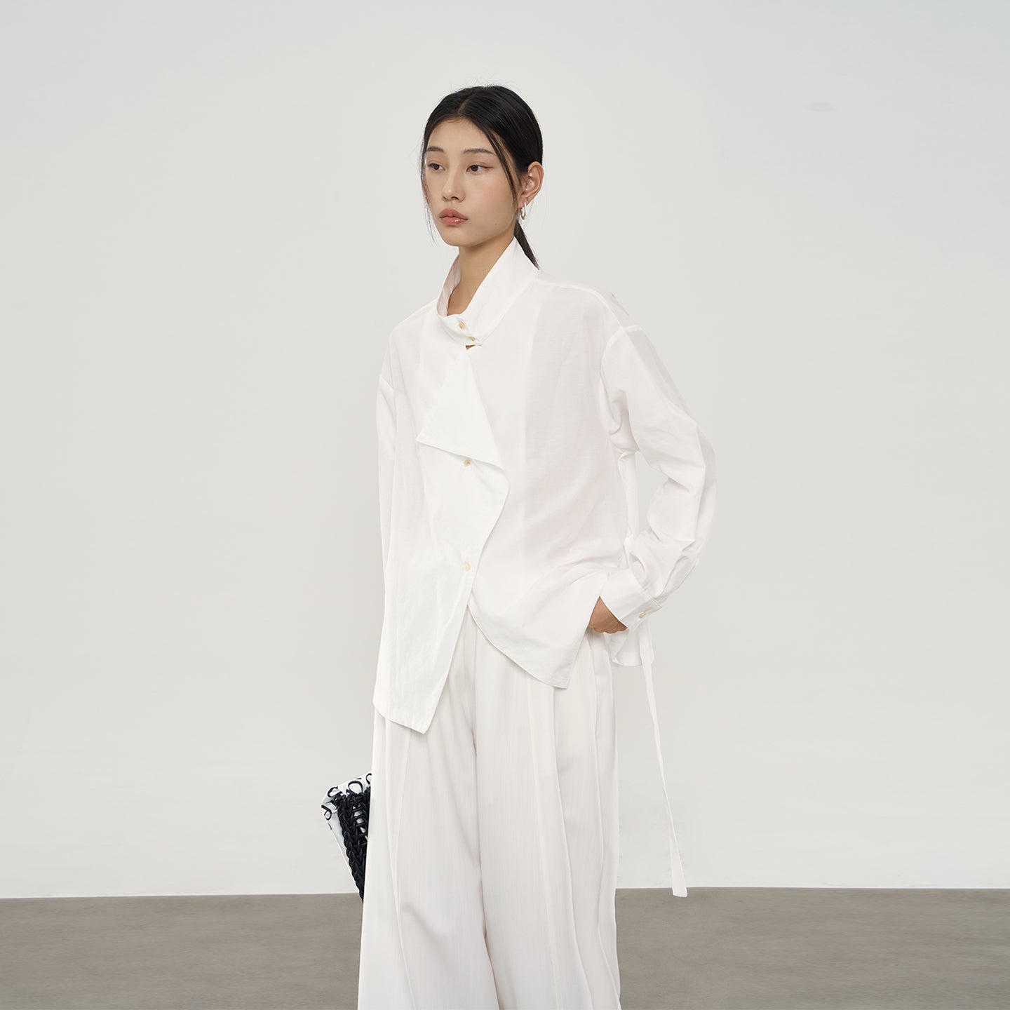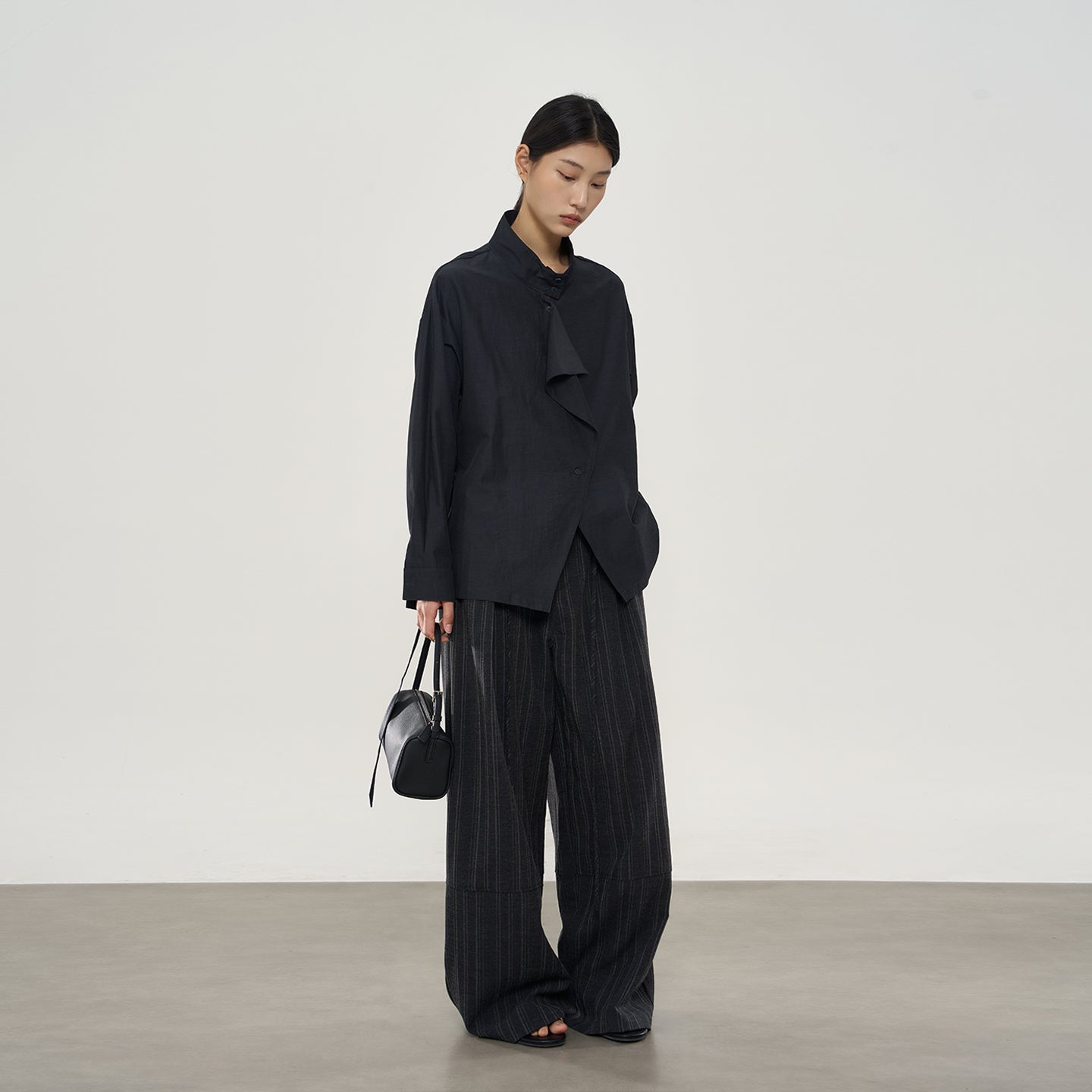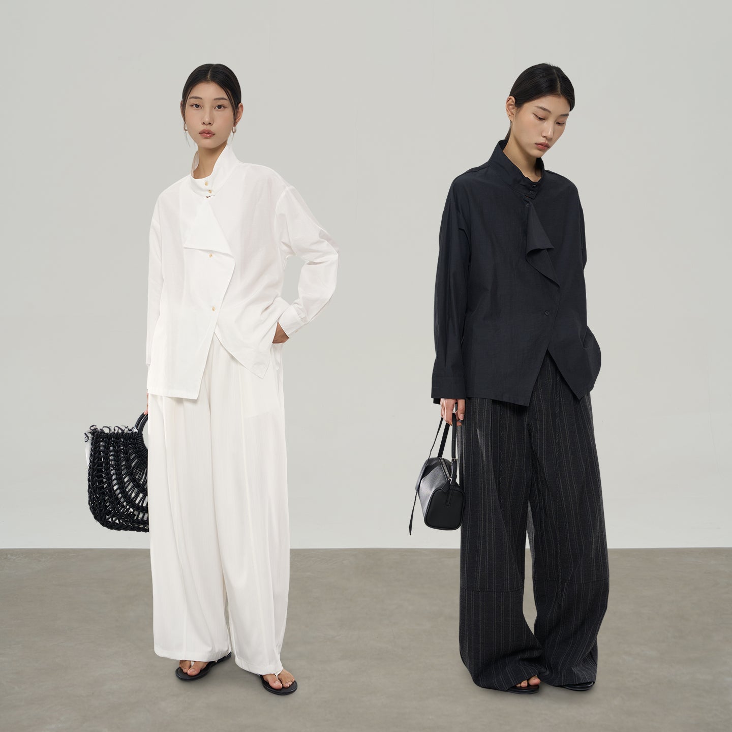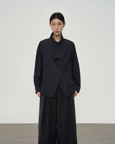 An asymmetrical placket and structured lapels create visual intrigue, breaking away from ordinary button-ups with modern designer appeal.