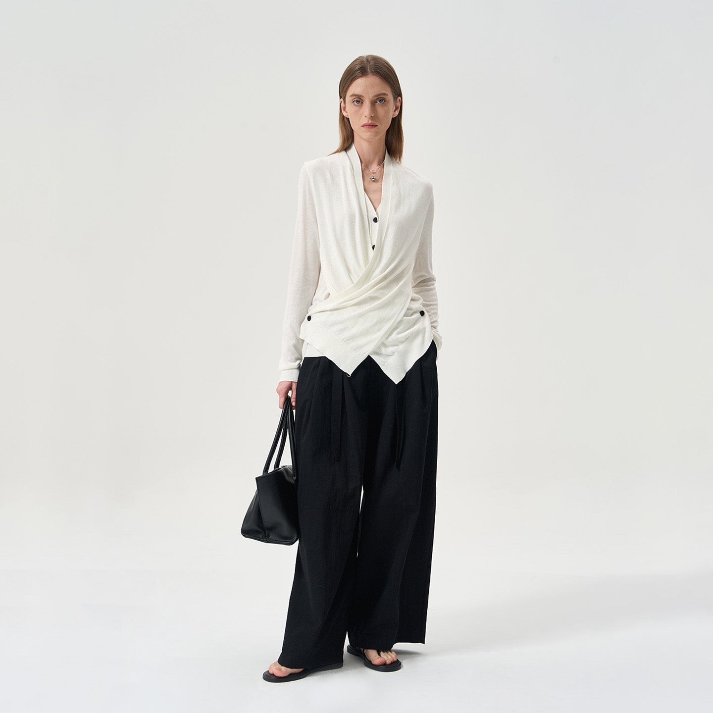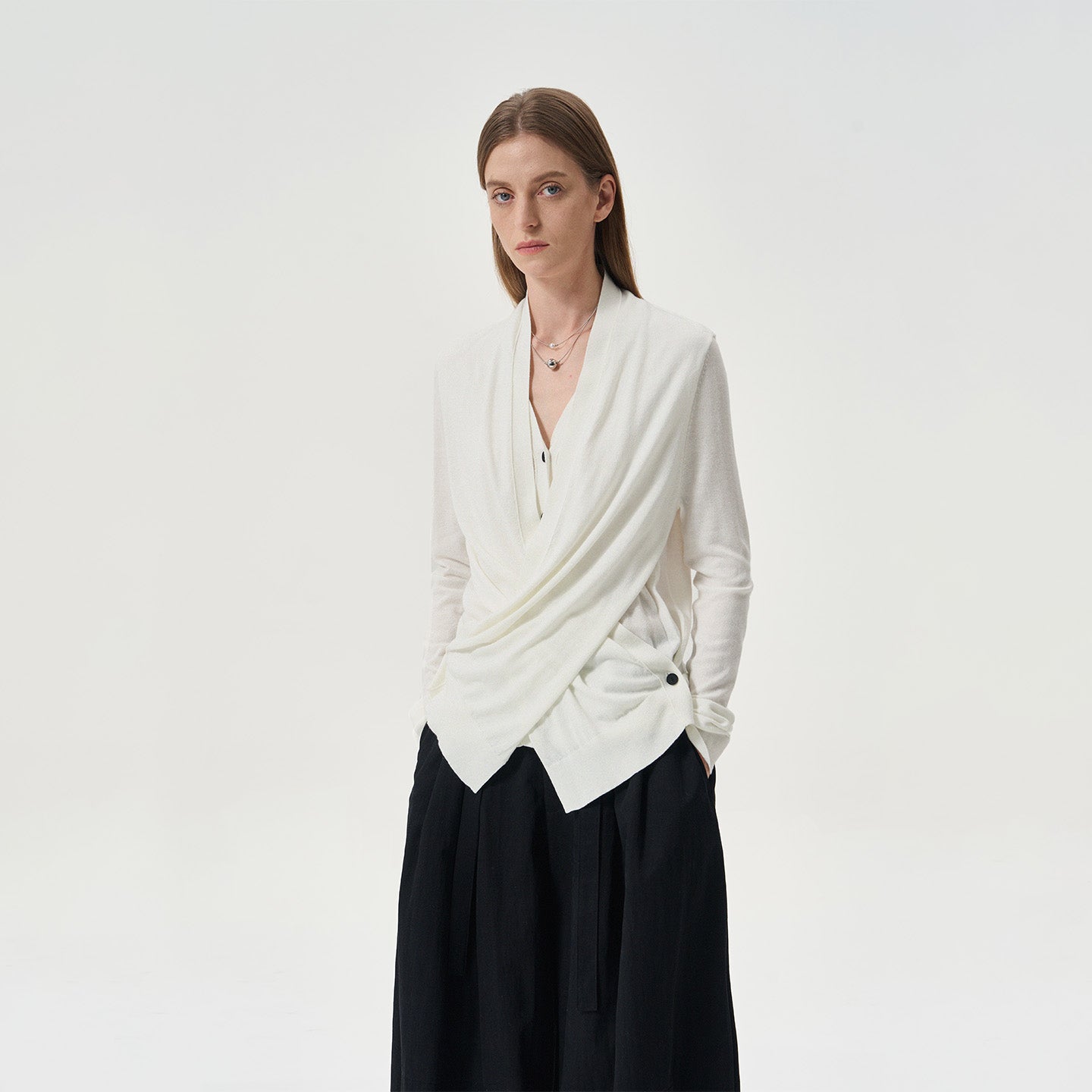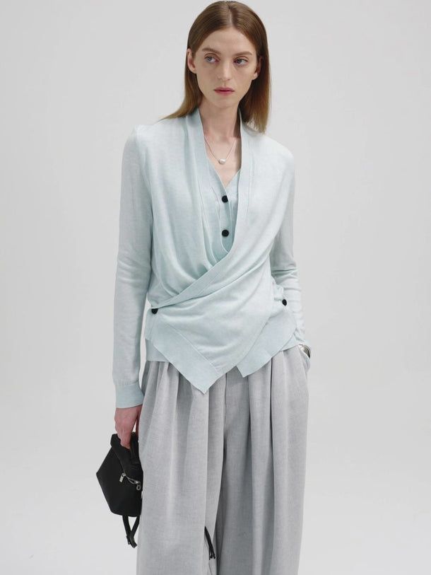 V-Neck Knit Sweater with Asymmetrical Wrap Design