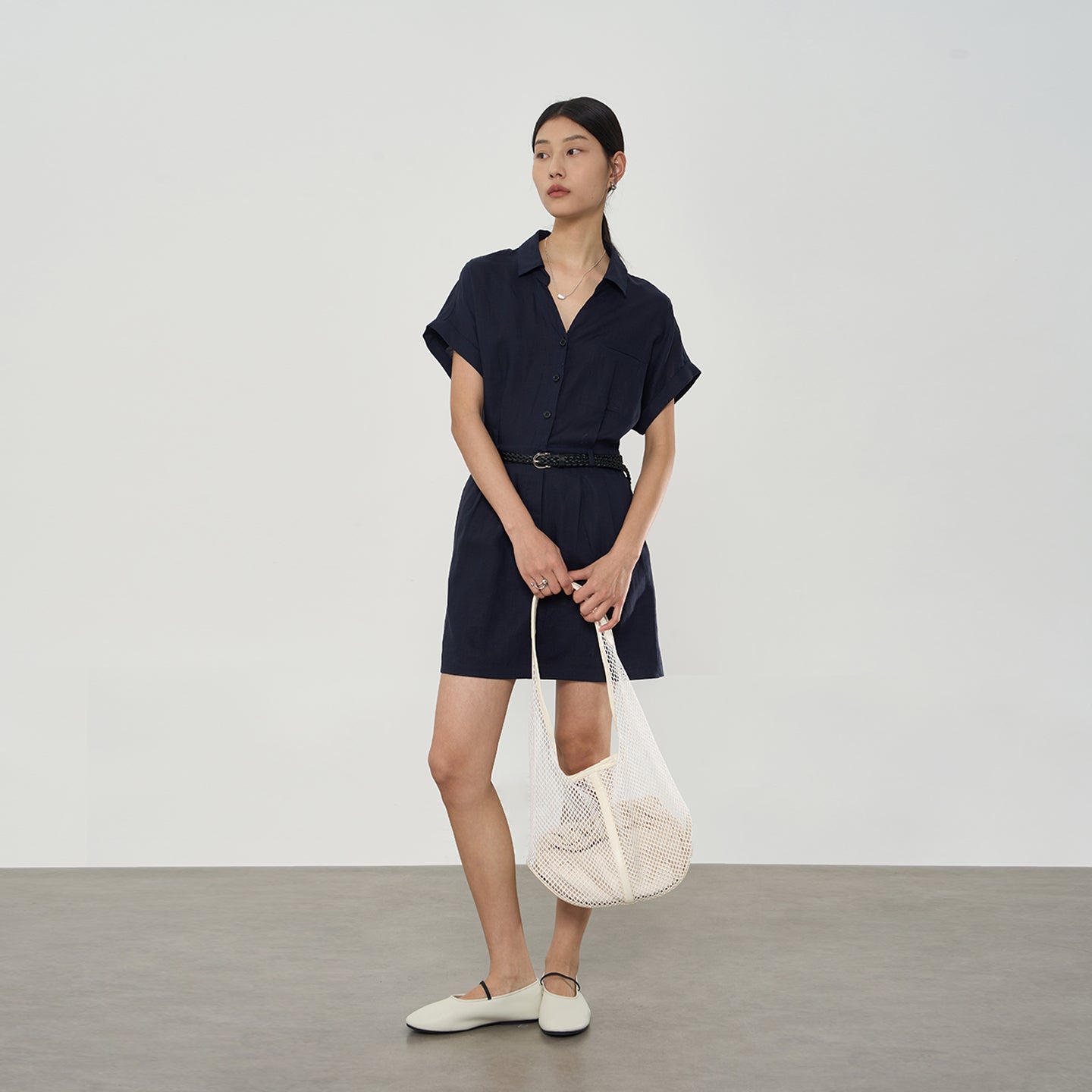 Designed with a relaxed loose fit, minimalist collar, and elegant V-neckline, this flattering shirt dress skims the body effortlessly. The half-open front balances polished professionalism with laid-back ease.