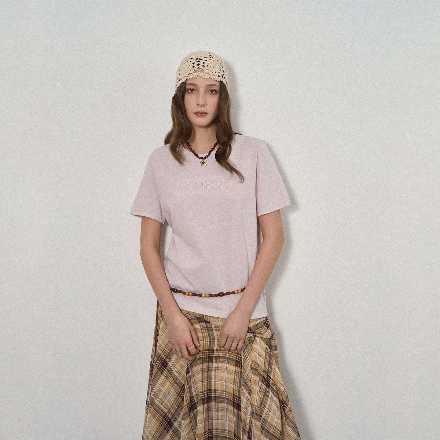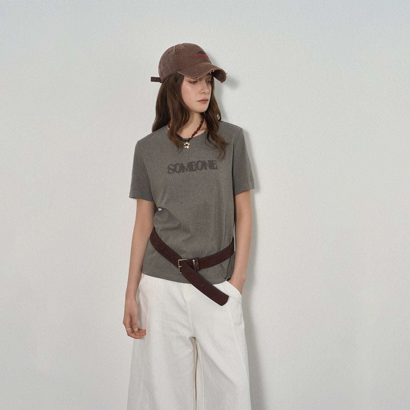 This letter print T-shirt features tonal “SOMEONE” embroidery that adds quiet depth to a clean, minimalist design—refined, modern, and effortlessly cool.