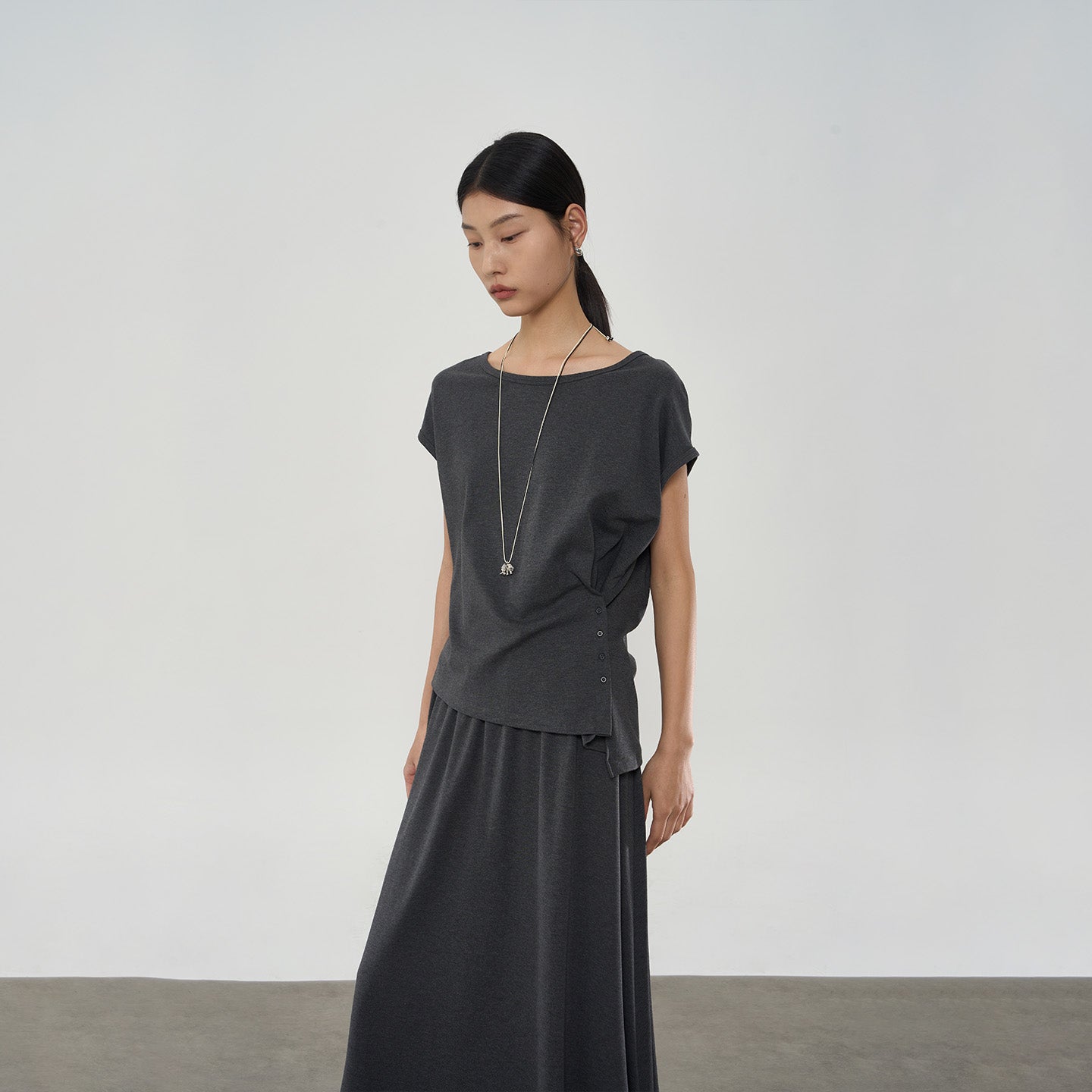 This short-sleeve knitwear set blends relaxed tailoring with modern minimalism. The dropped-shoulder top and matching wide-leg skirt create clean, flowing lines that flatter every silhouette for an effortlessly polished look.