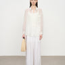 The slimming V-neck enhances the neckline, while subtle embroidery and tie-back details add texture and dimension, creating a polished yet relaxed silhouette.