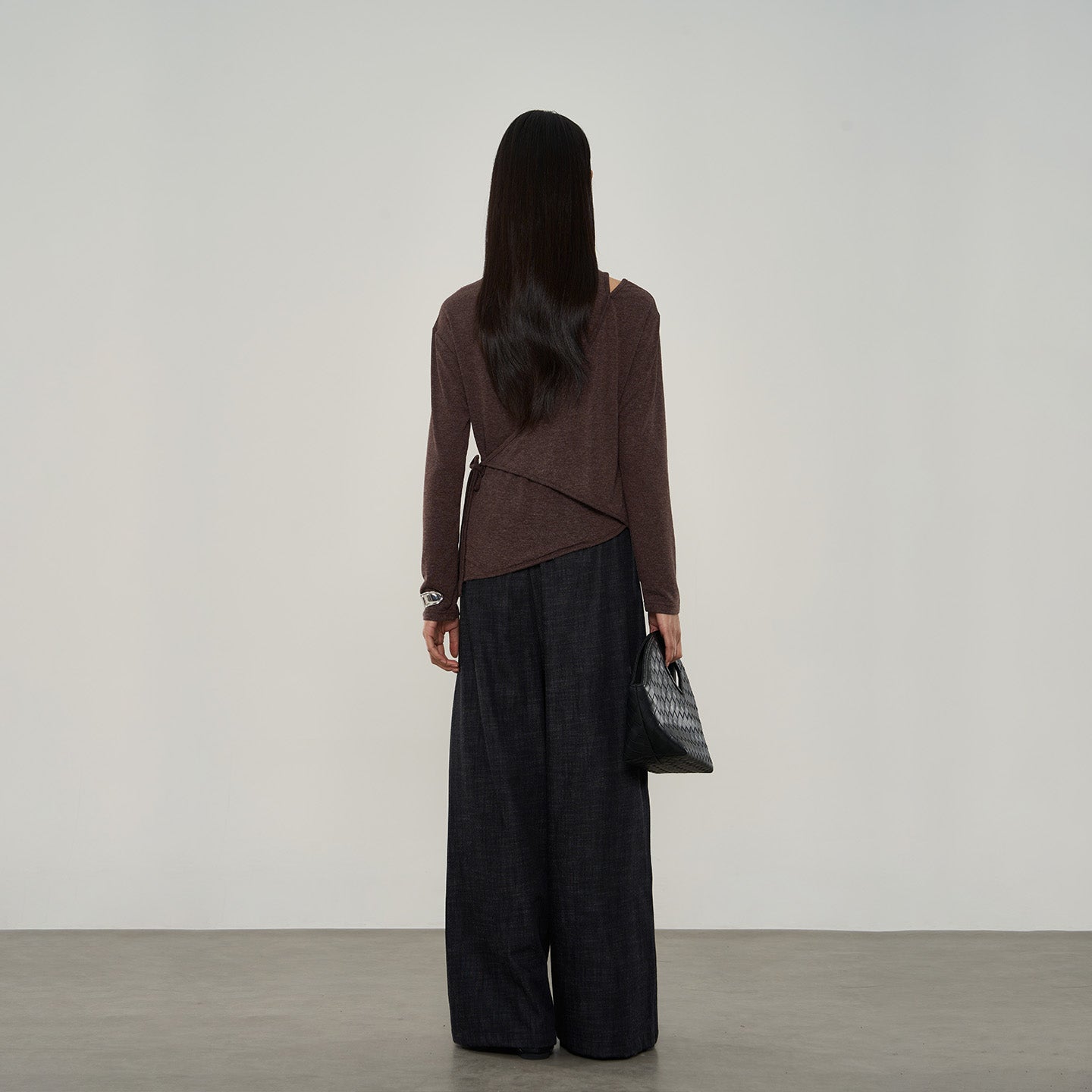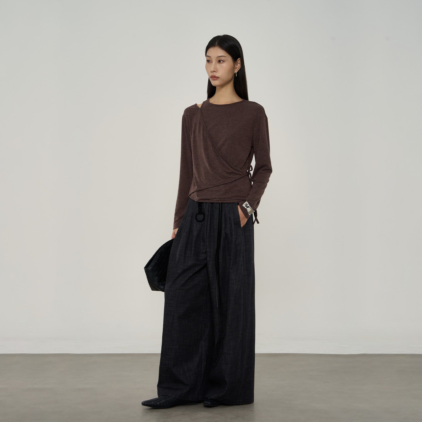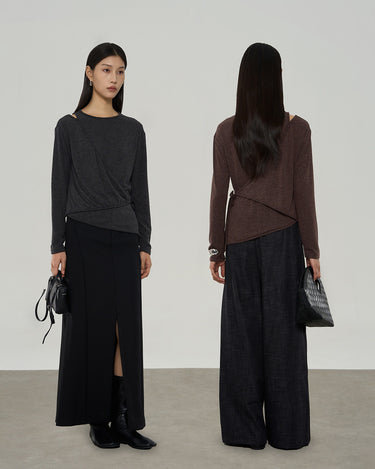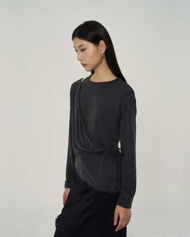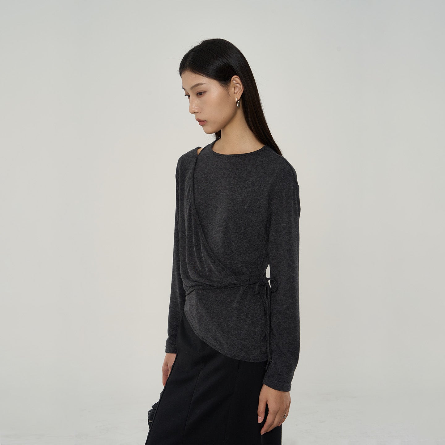 Modern asymmetrical knit top with cross-strap detail, adjustable drawstring waist, soft fabric and elongated hem—perfect for chic layering or standout solo wear.