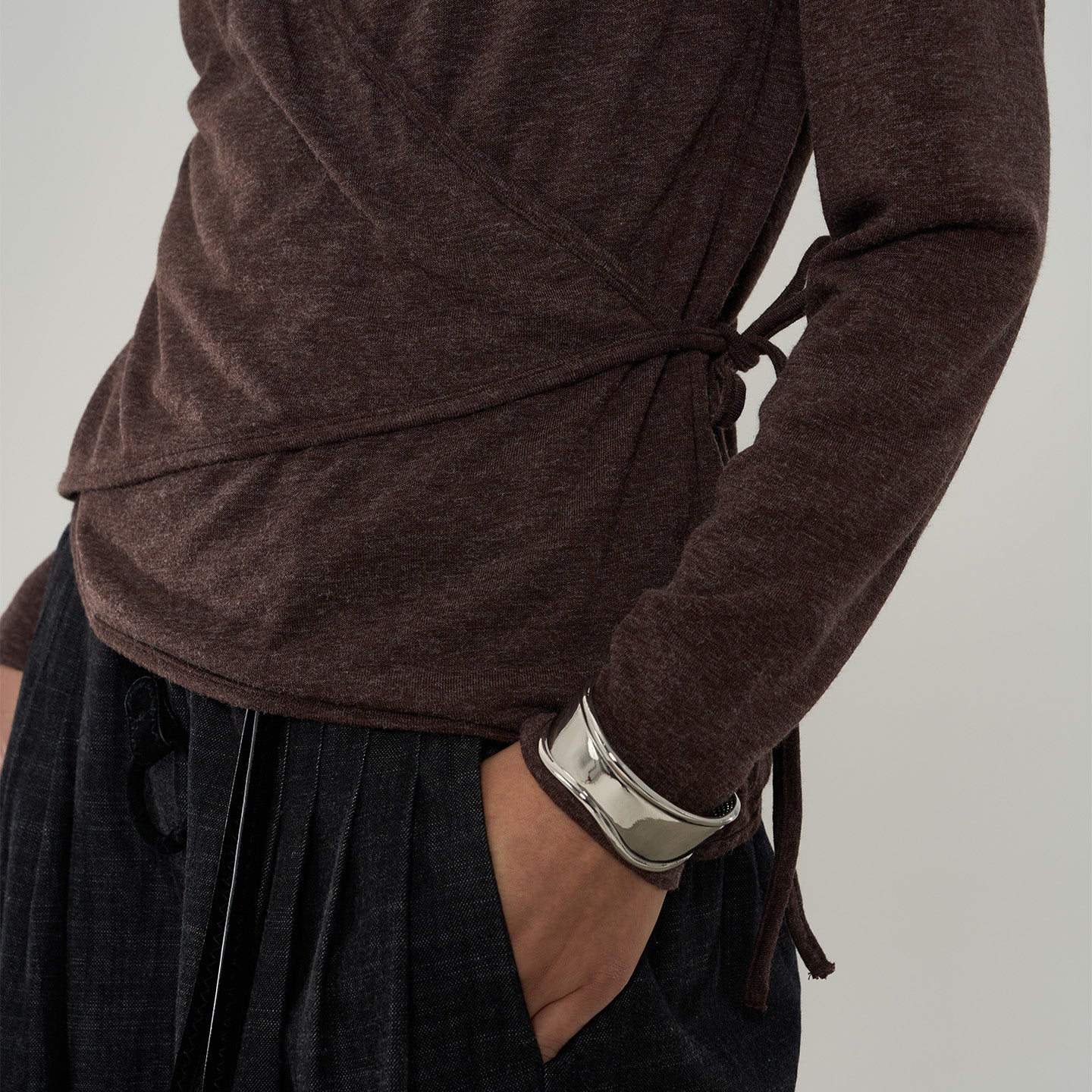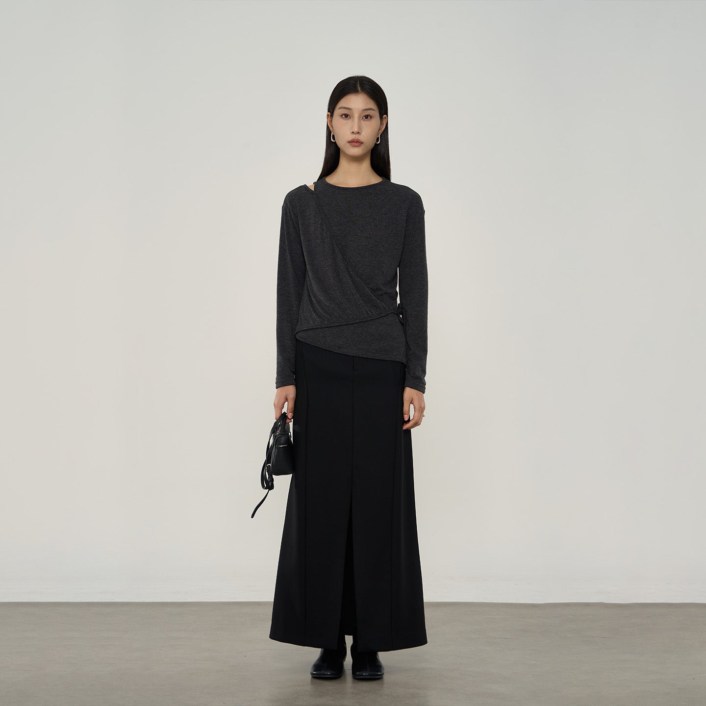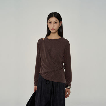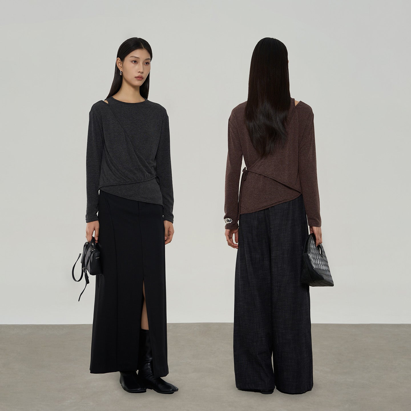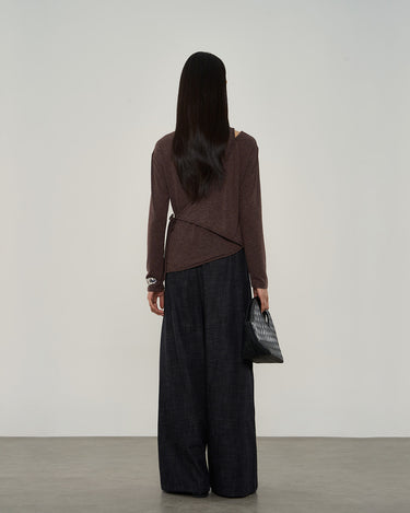 Modern asymmetrical knit top with cross-strap detail, adjustable drawstring waist, soft fabric and elongated hem—perfect for chic layering or standout solo wear.