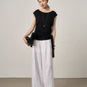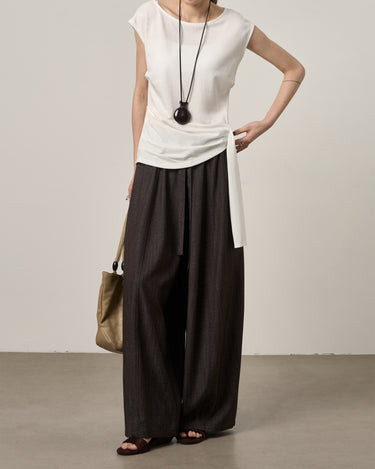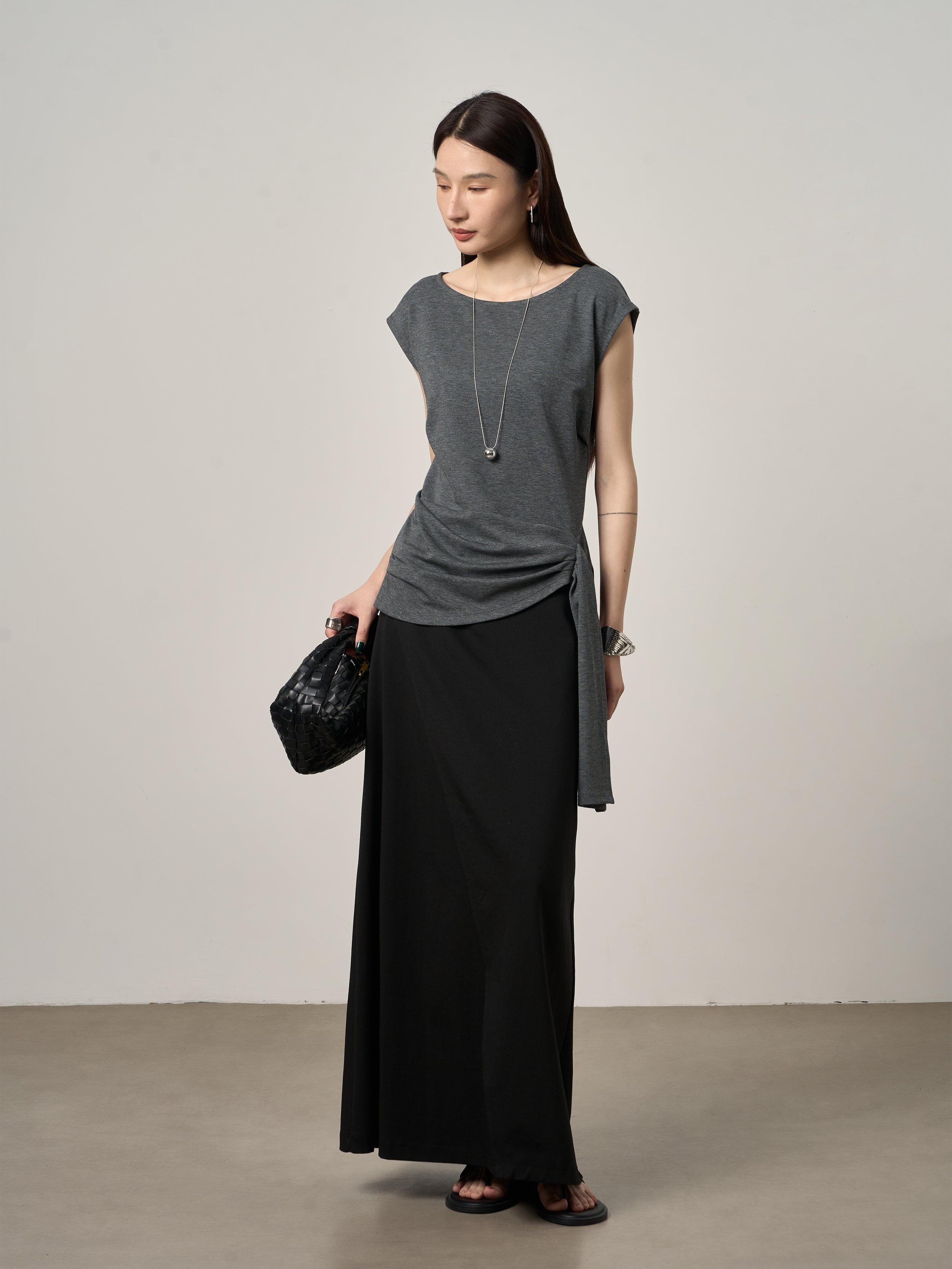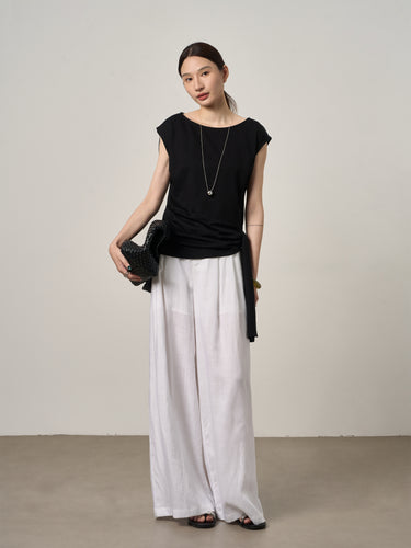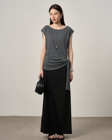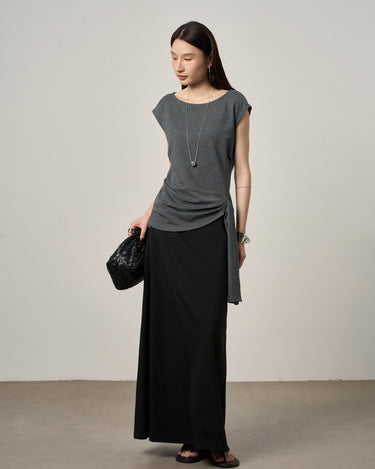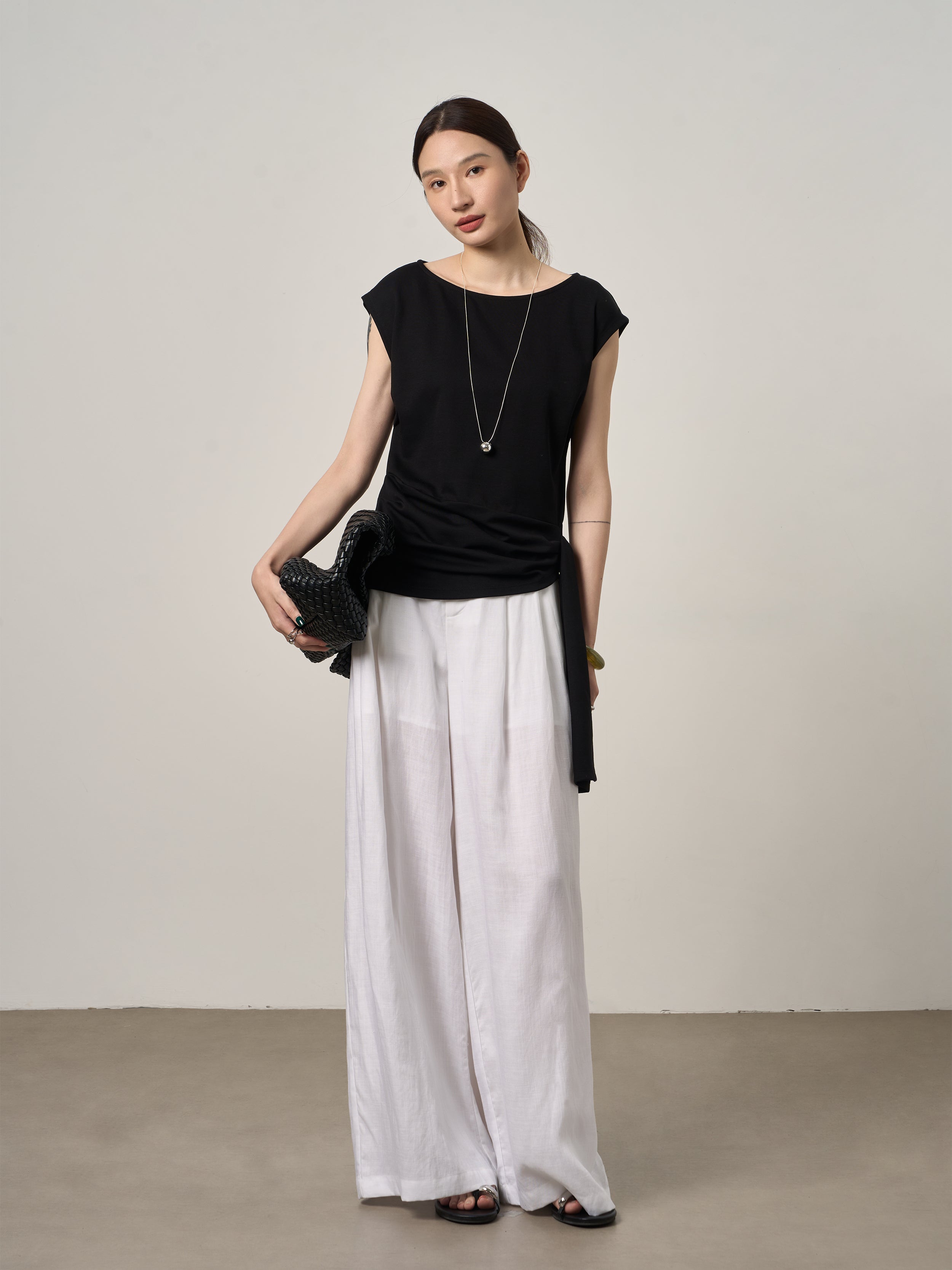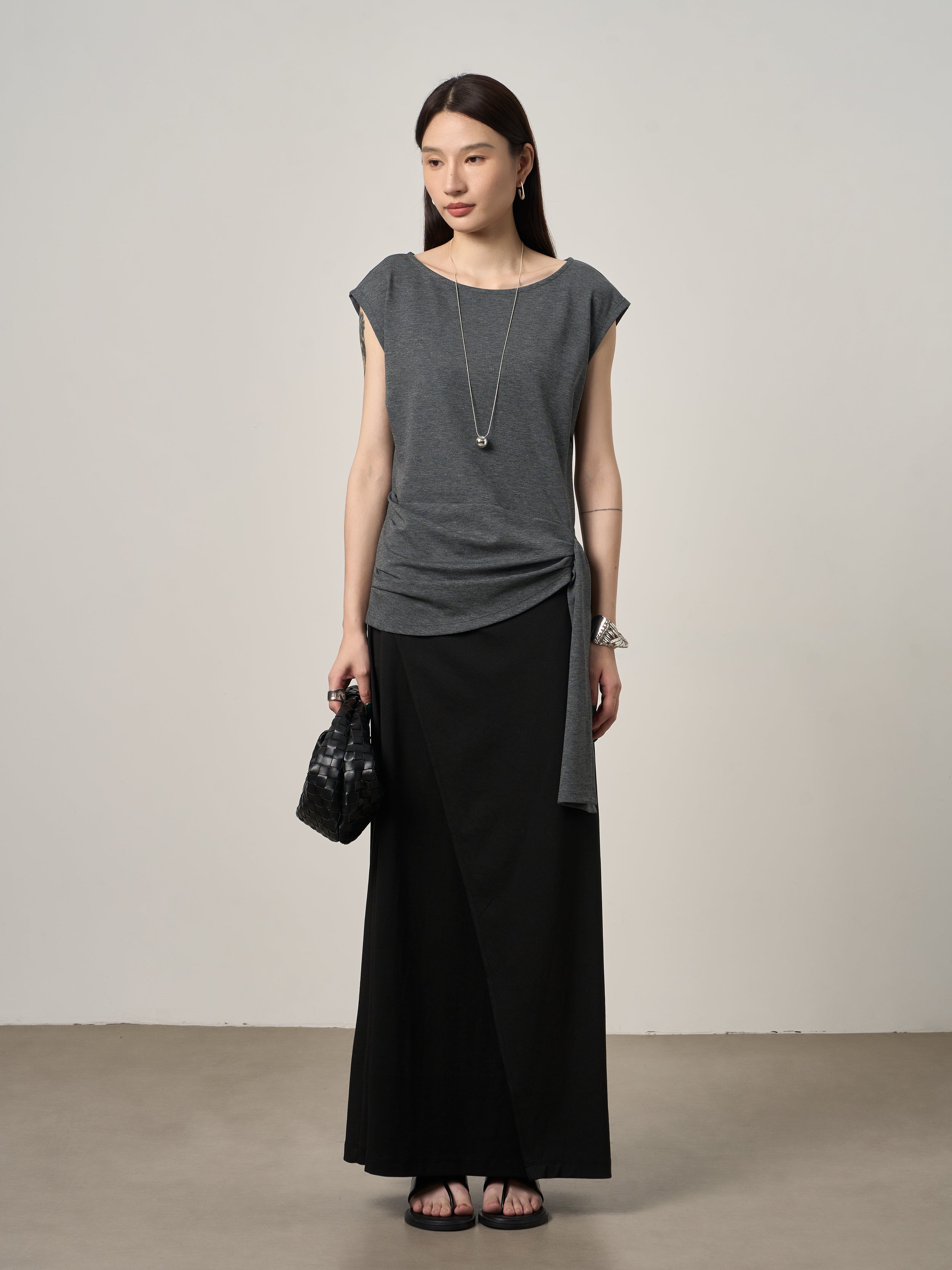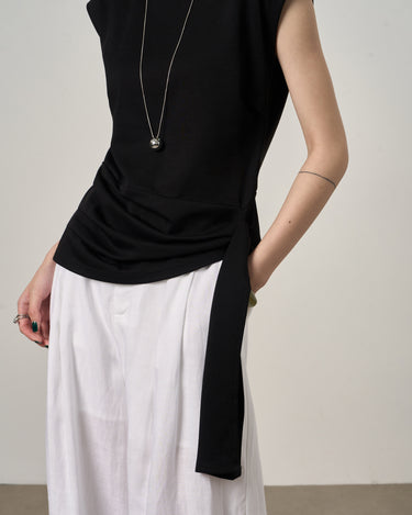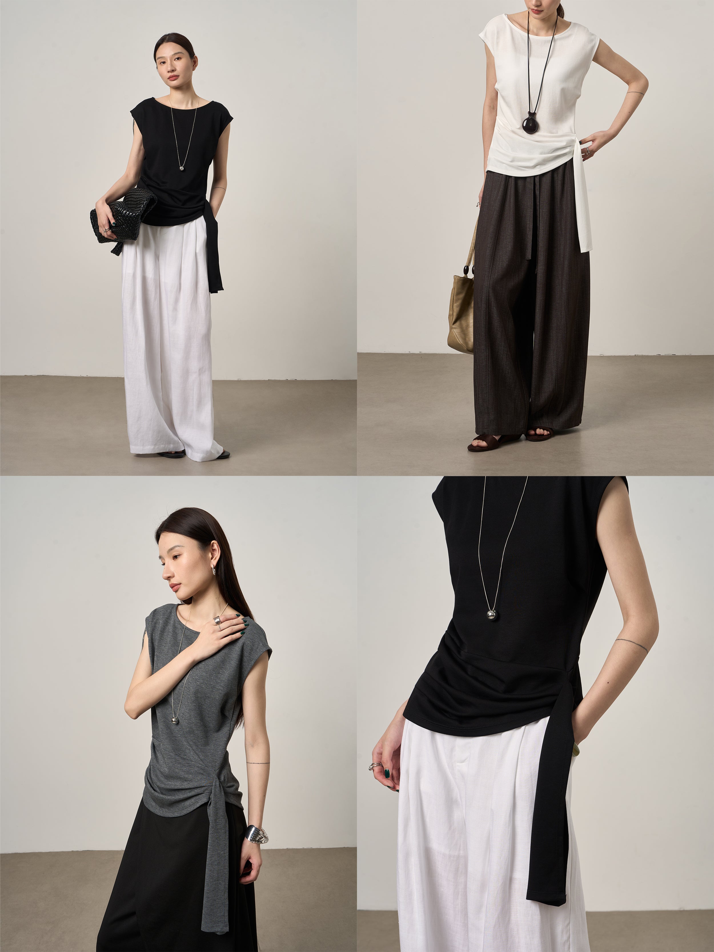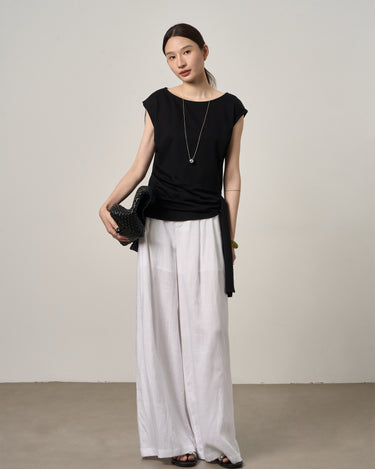 Featuring a boat neckline, dropped shoulders, and side pleats with a tie-belt, this top enhances your figure with a slimming 3:7 proportion. The asymmetrical cut creates a dynamic, elongating effect.
