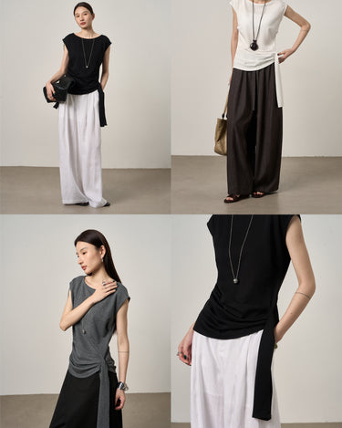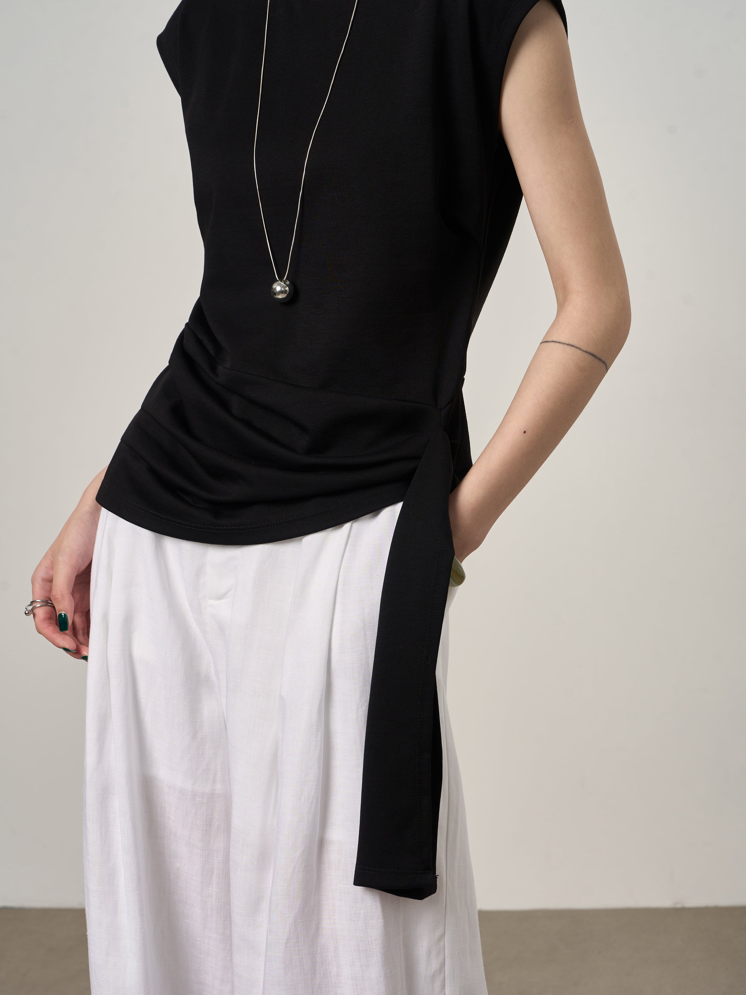 Elevate your wardrobe with this asymmetrical short-sleeve top, designed for a modern, minimalist look. The sleek black silhouette delivers timeless sophistication, perfect for work, travel, or everyday wear.