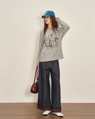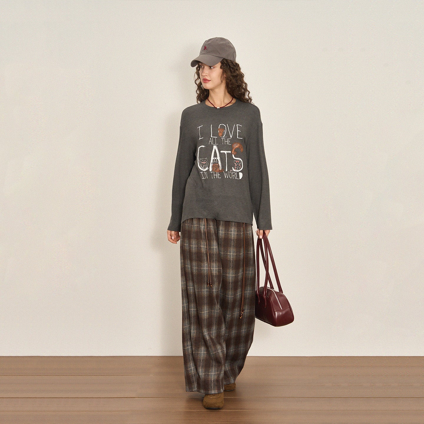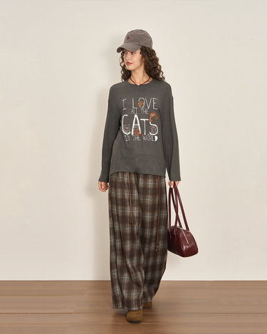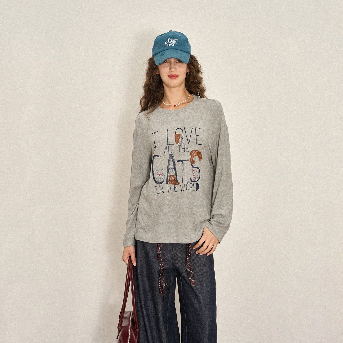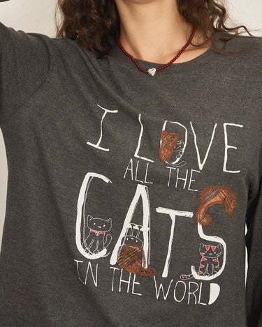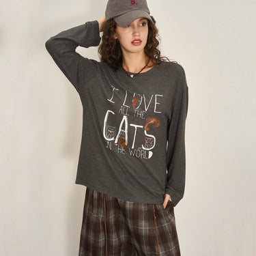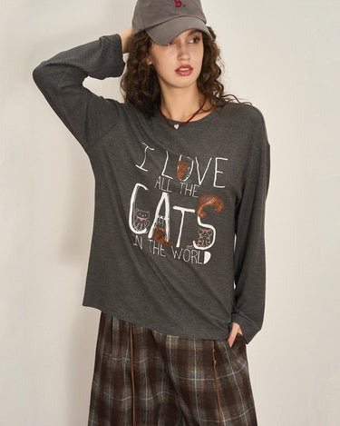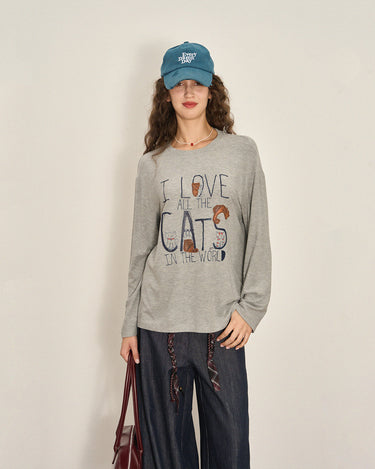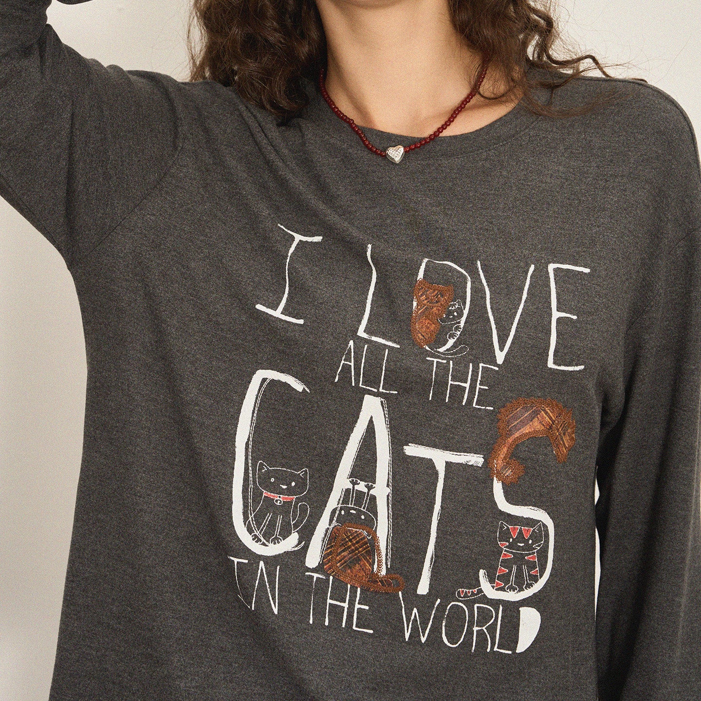 Featuring the bold slogan “I Love All Cats in the World,” this crew neck knit top is finished with charming kitten embroidery that adds instant personality and joy to everyday outfits.