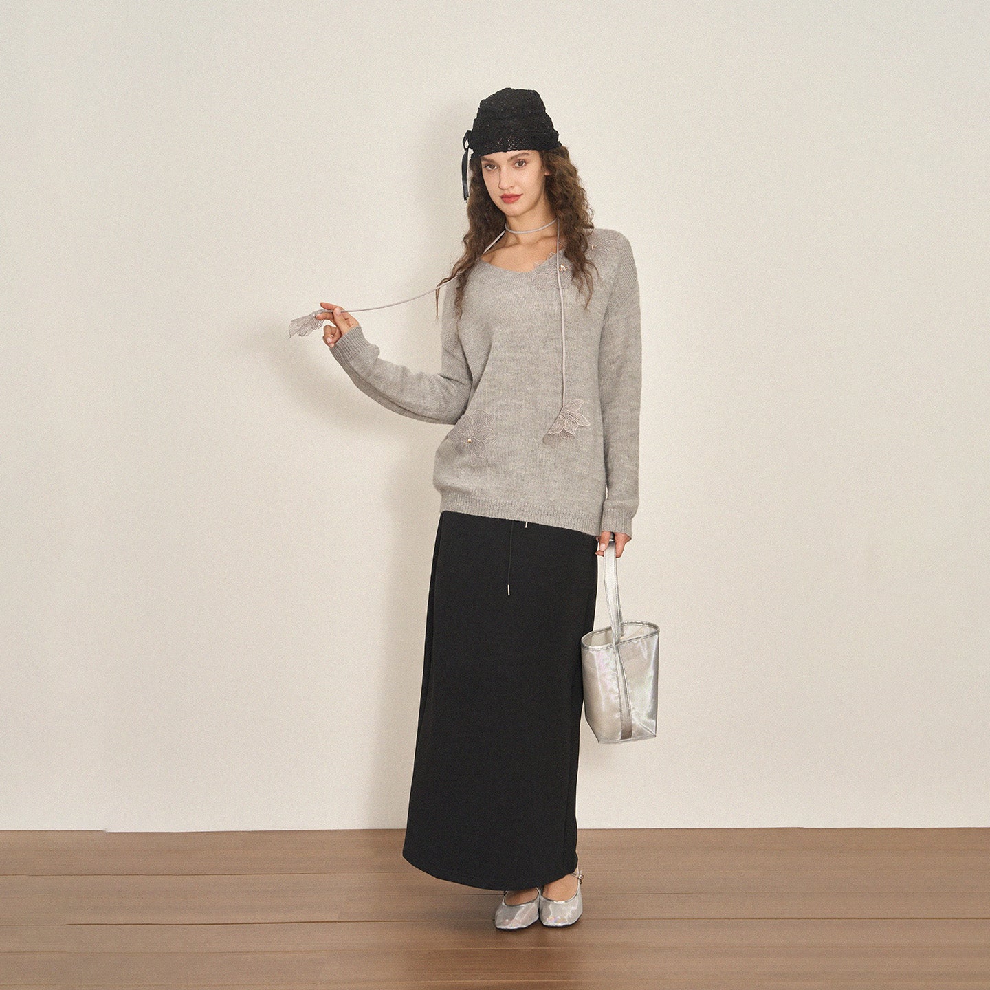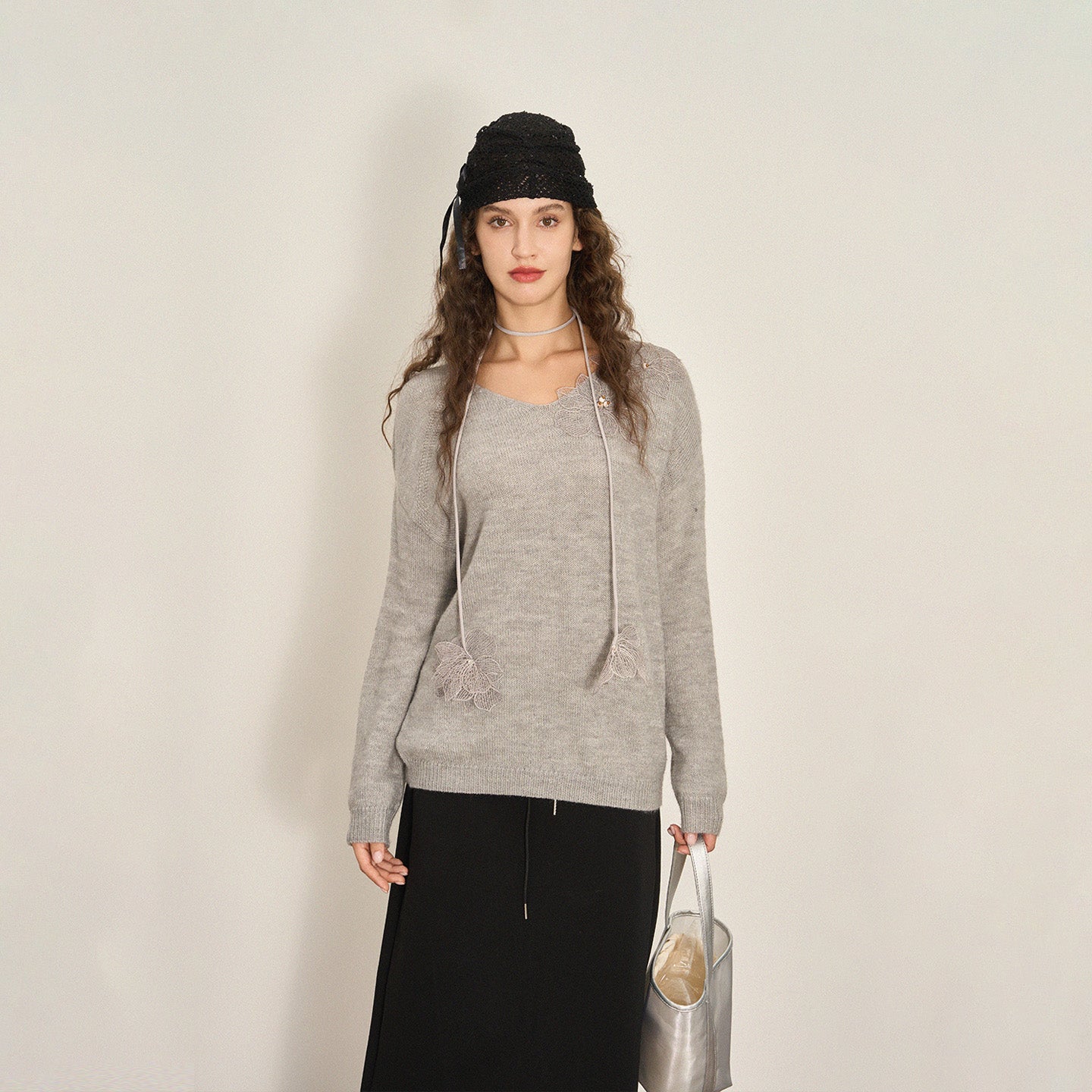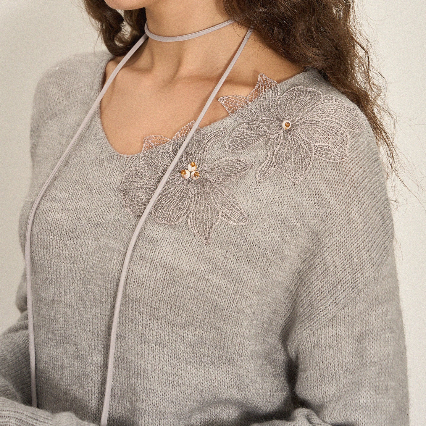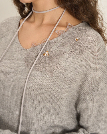 This wool-blend V-neck sweater is adorned with delicate floral lace appliqués and pearl accents, creating a refined, feminine texture with irresistible visual depth—perfect for festive moments and elevated daily wear.
