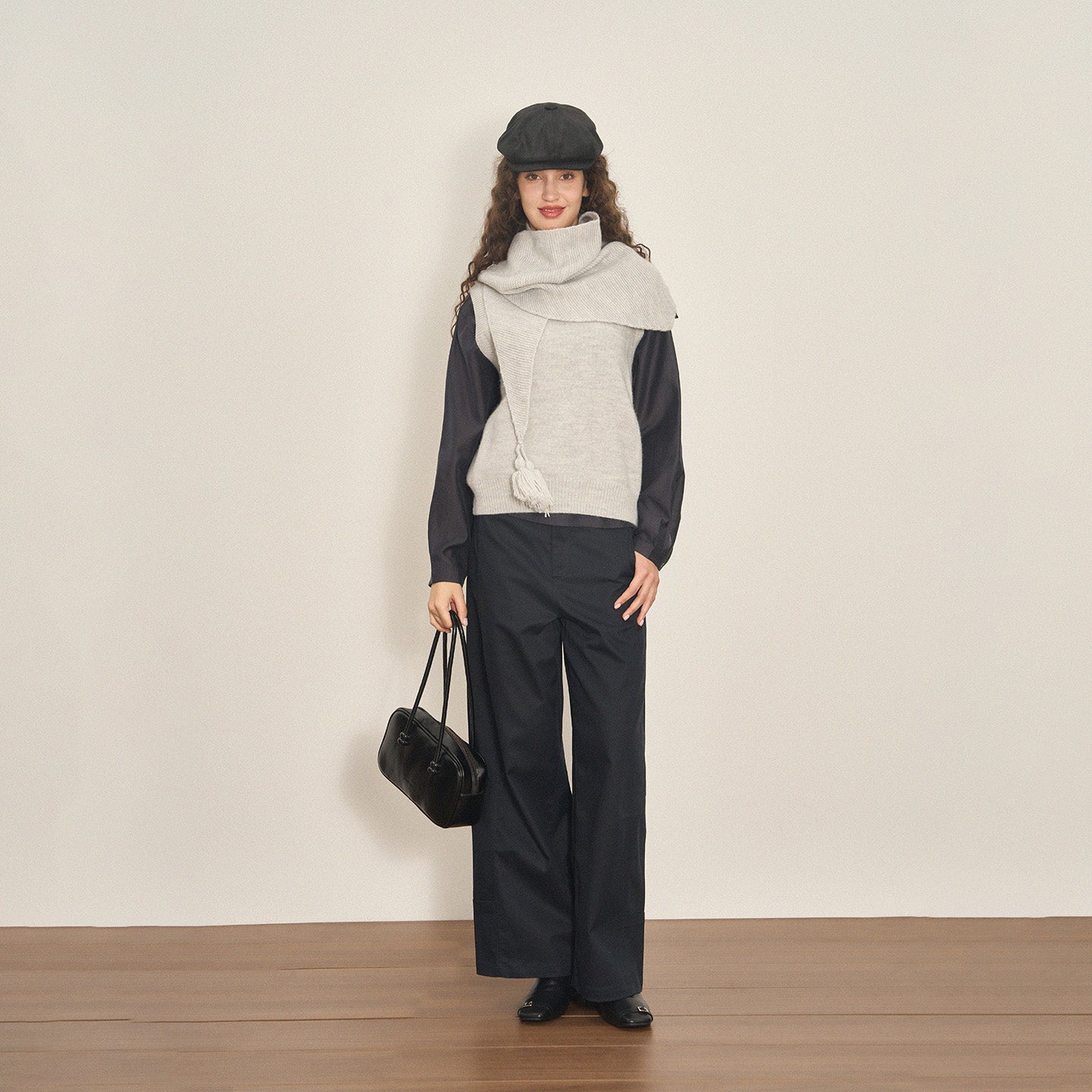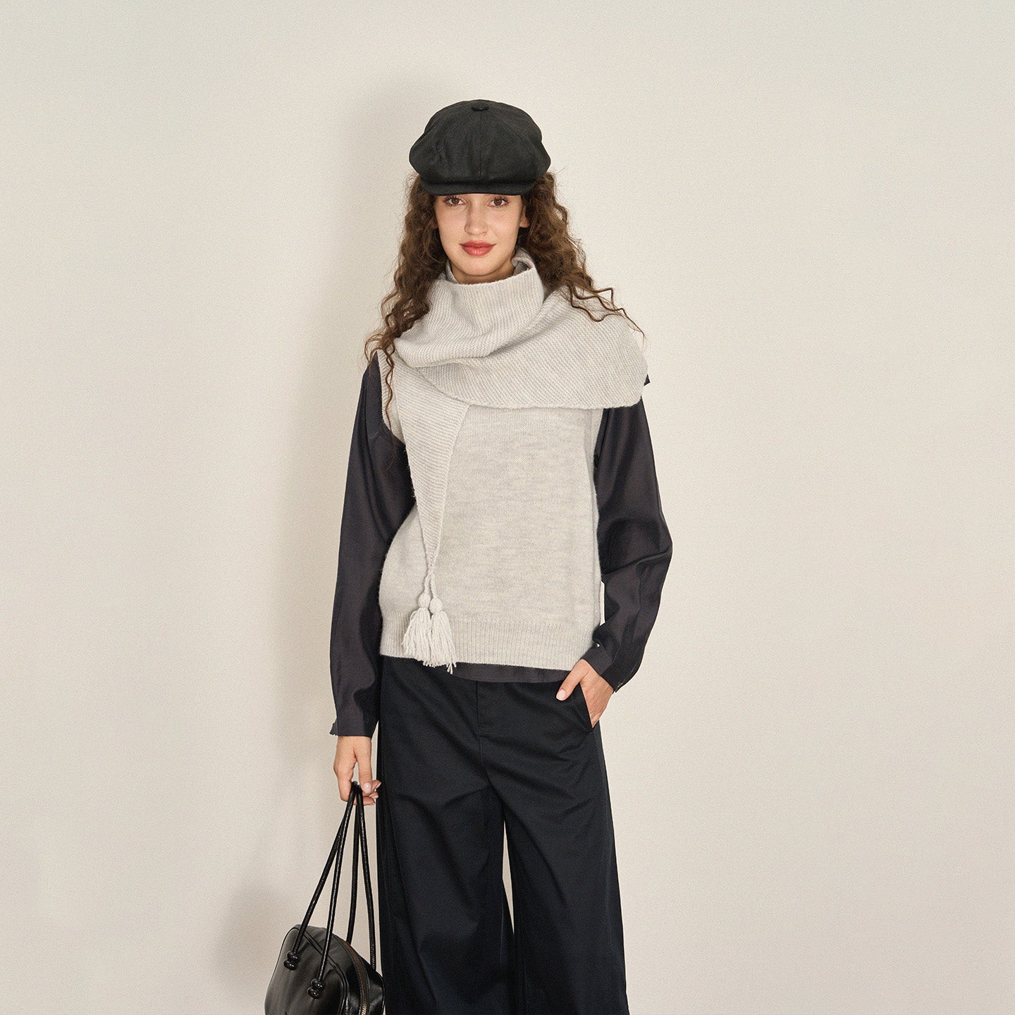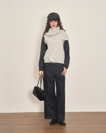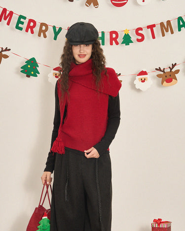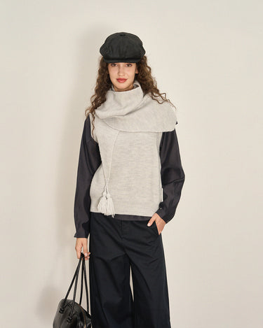 This scarf-style sleeveless knit features a built-in neck warmer that delivers cozy warmth without styling effort—perfect for crisp autumn and winter days with effortless polish.