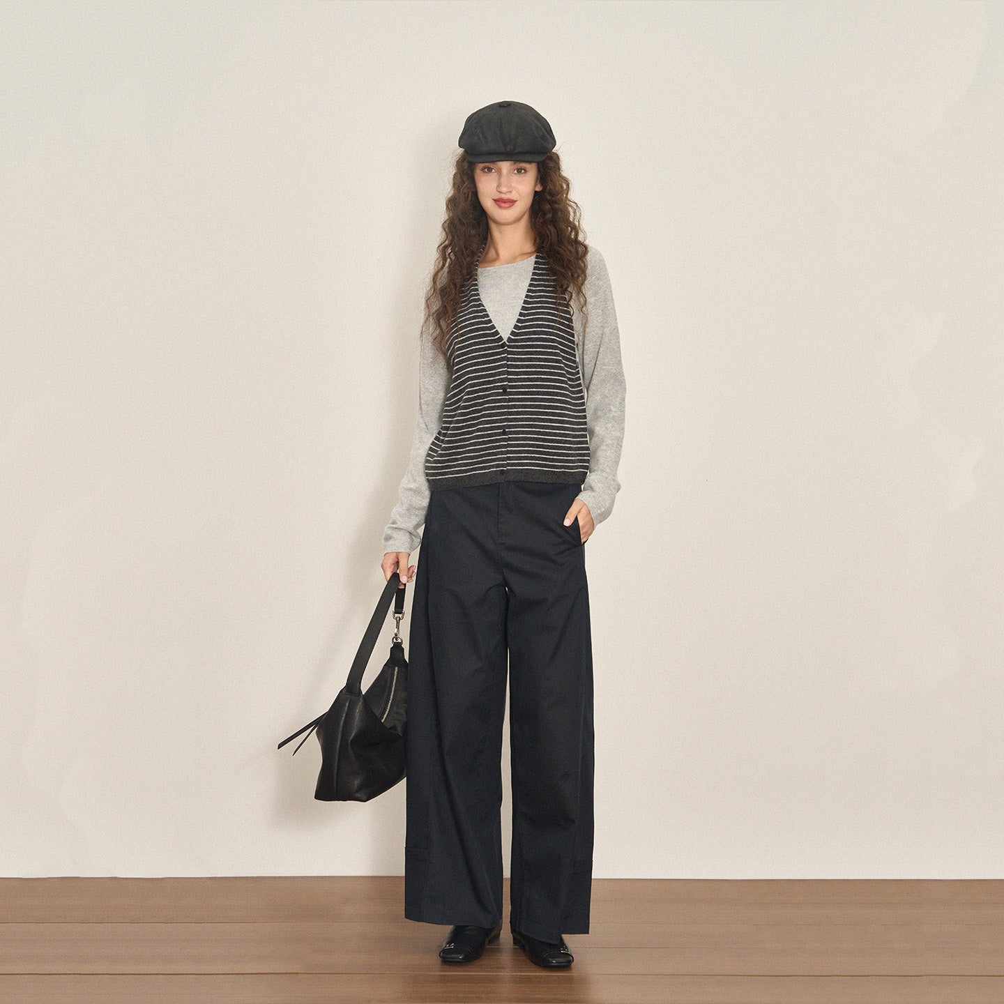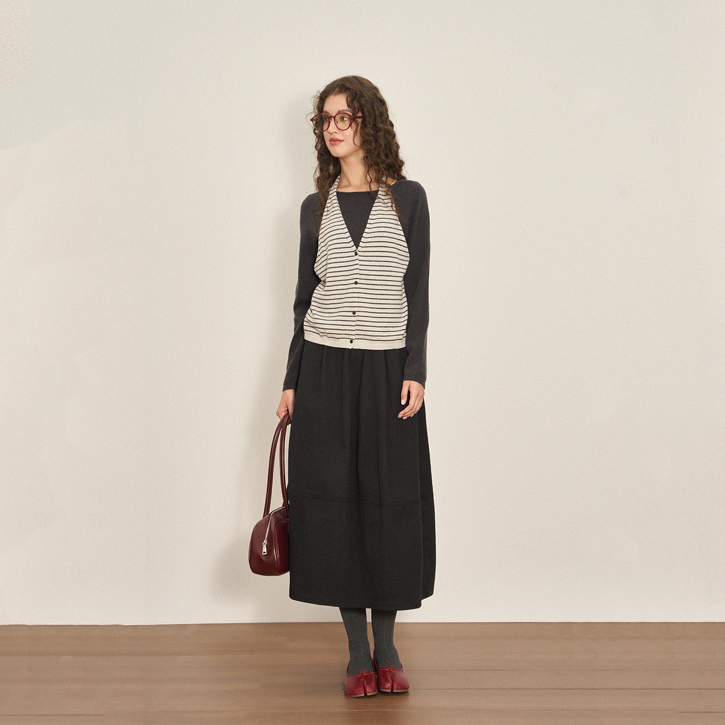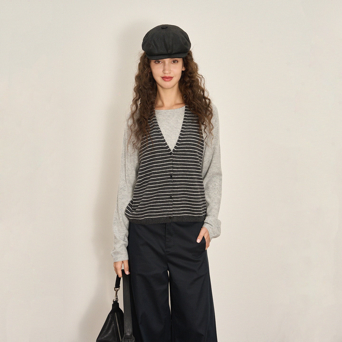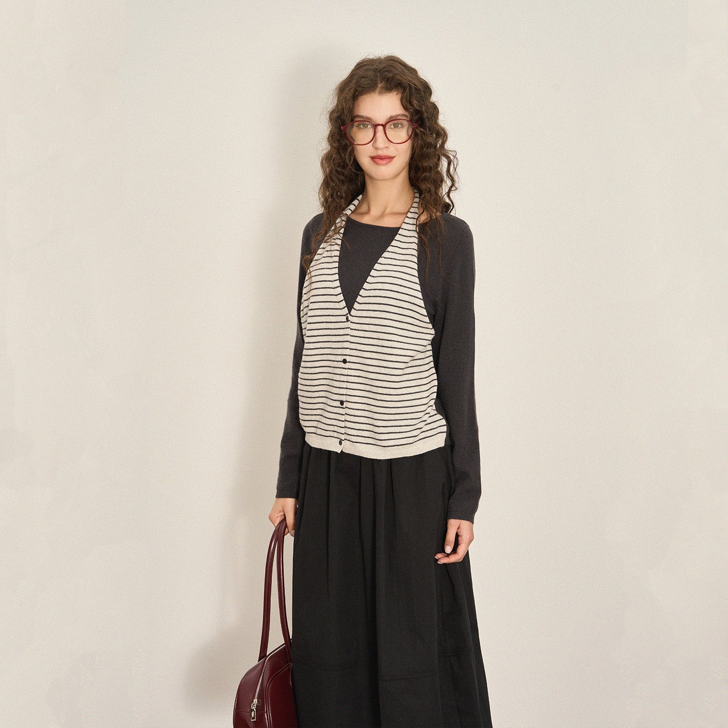 Classic color blocking pairs seamlessly with skirts or trousers, creating a relaxed yet mature aesthetic ideal for daily wear, work, or casual outings.