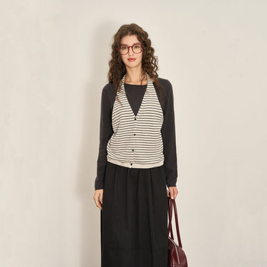 Designed with a halter neck and V-neckline, it beautifully highlights the shoulders and elongates the neckline. The fine stripes and soft wool-blend knit hug the body gently without feeling restrictive.