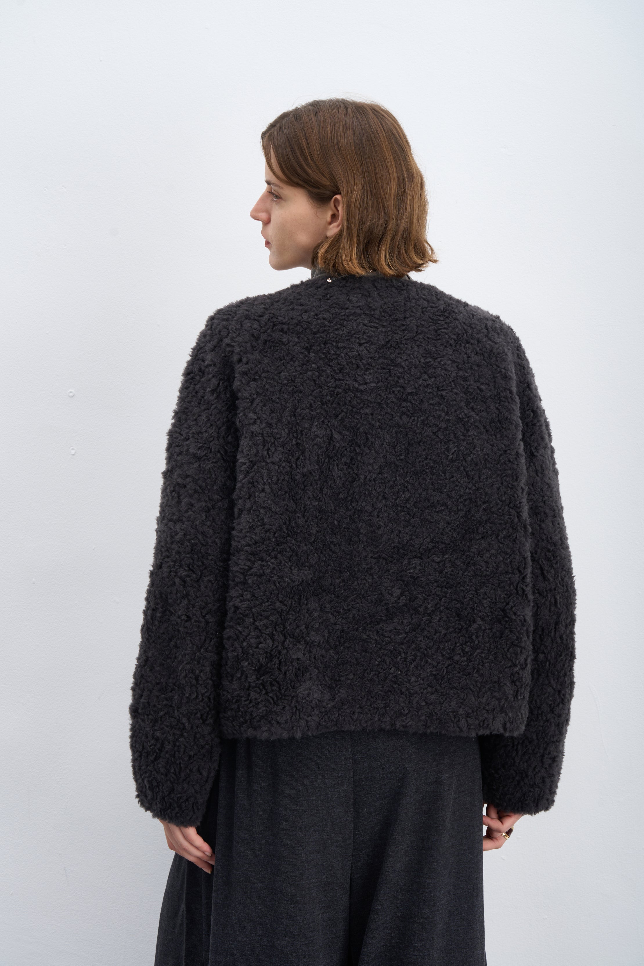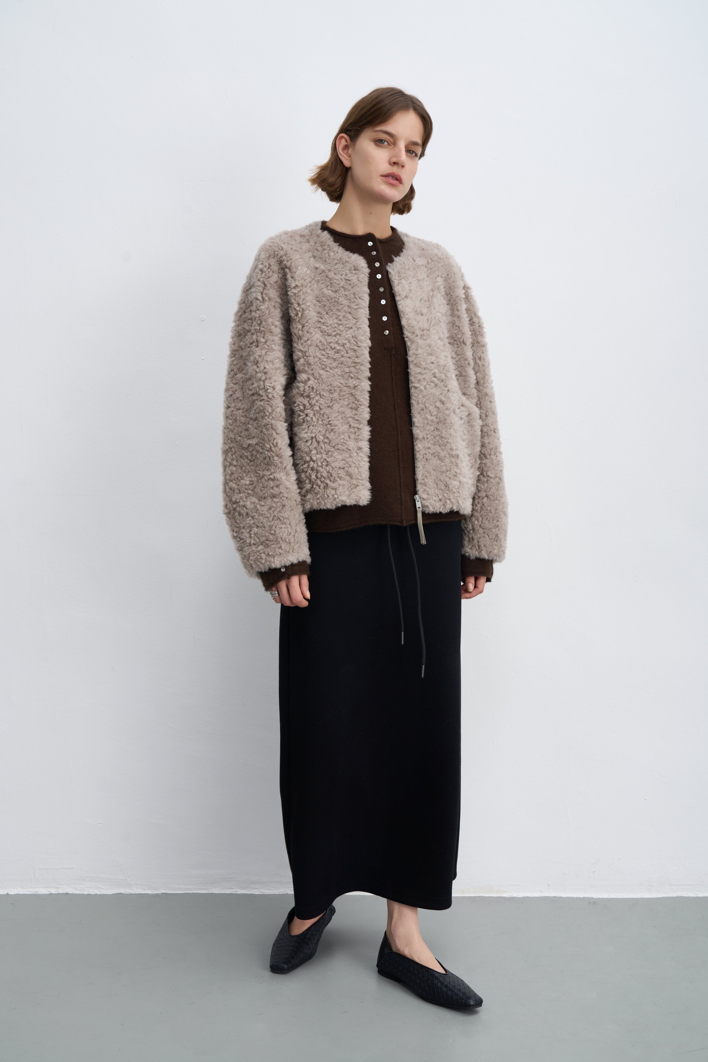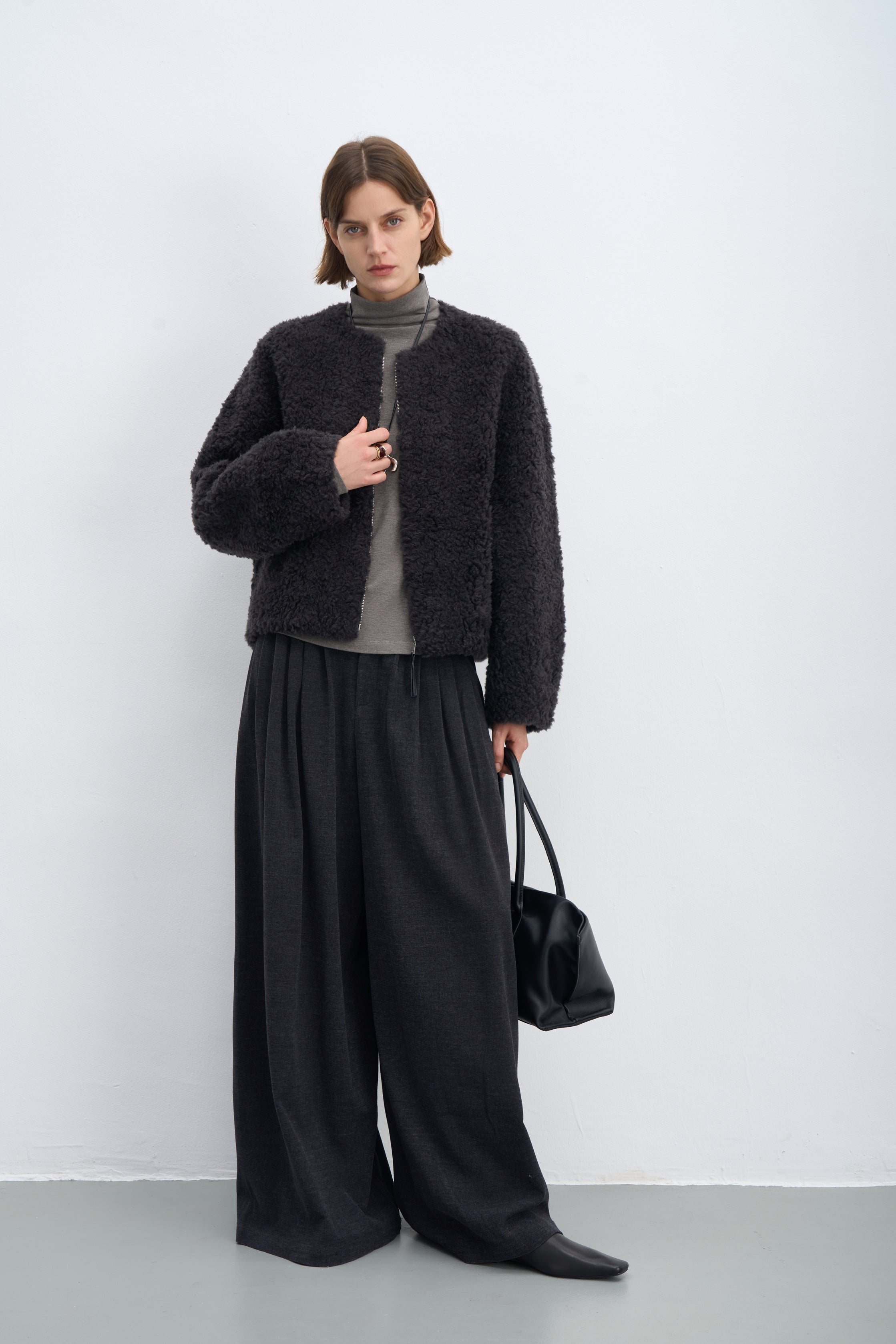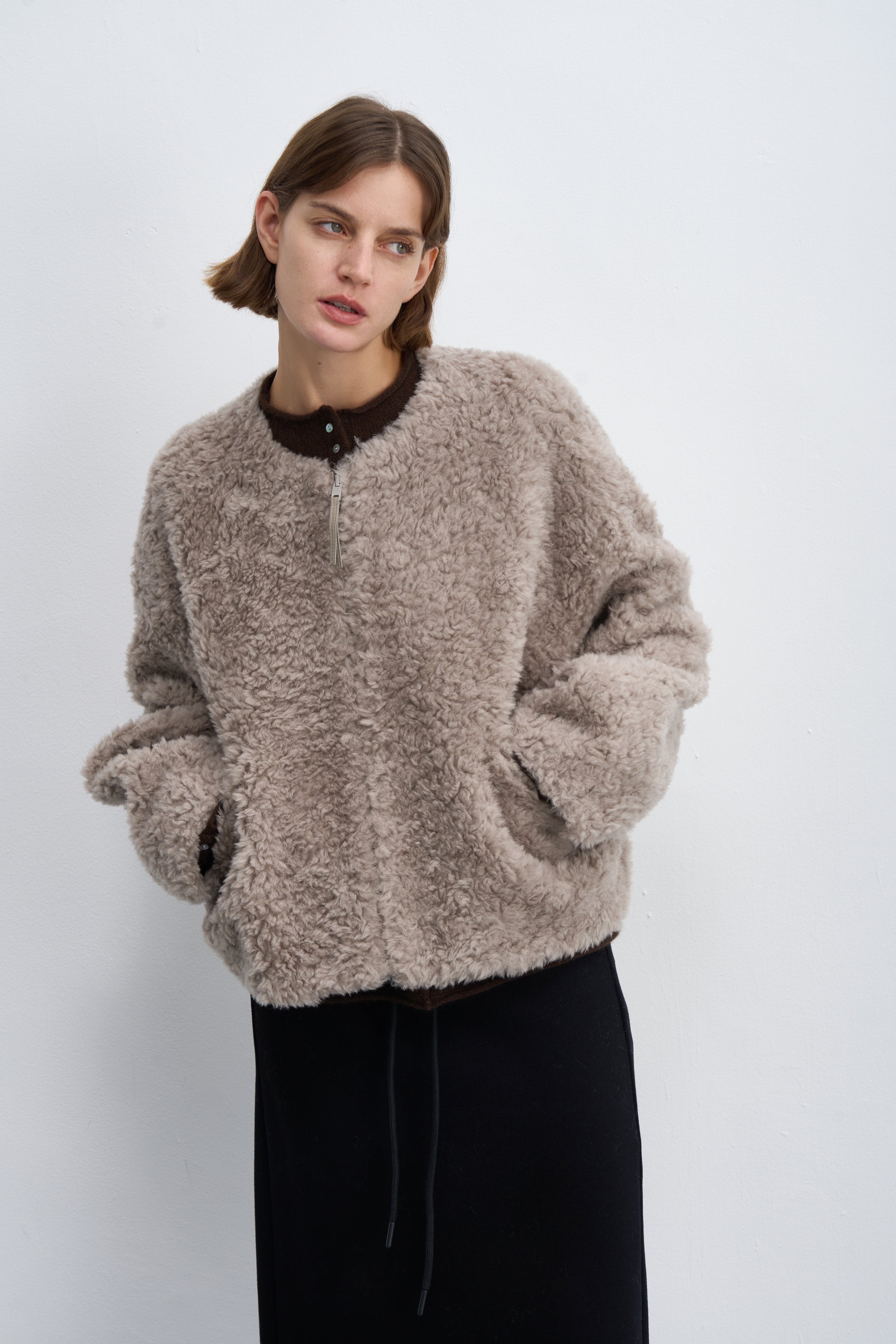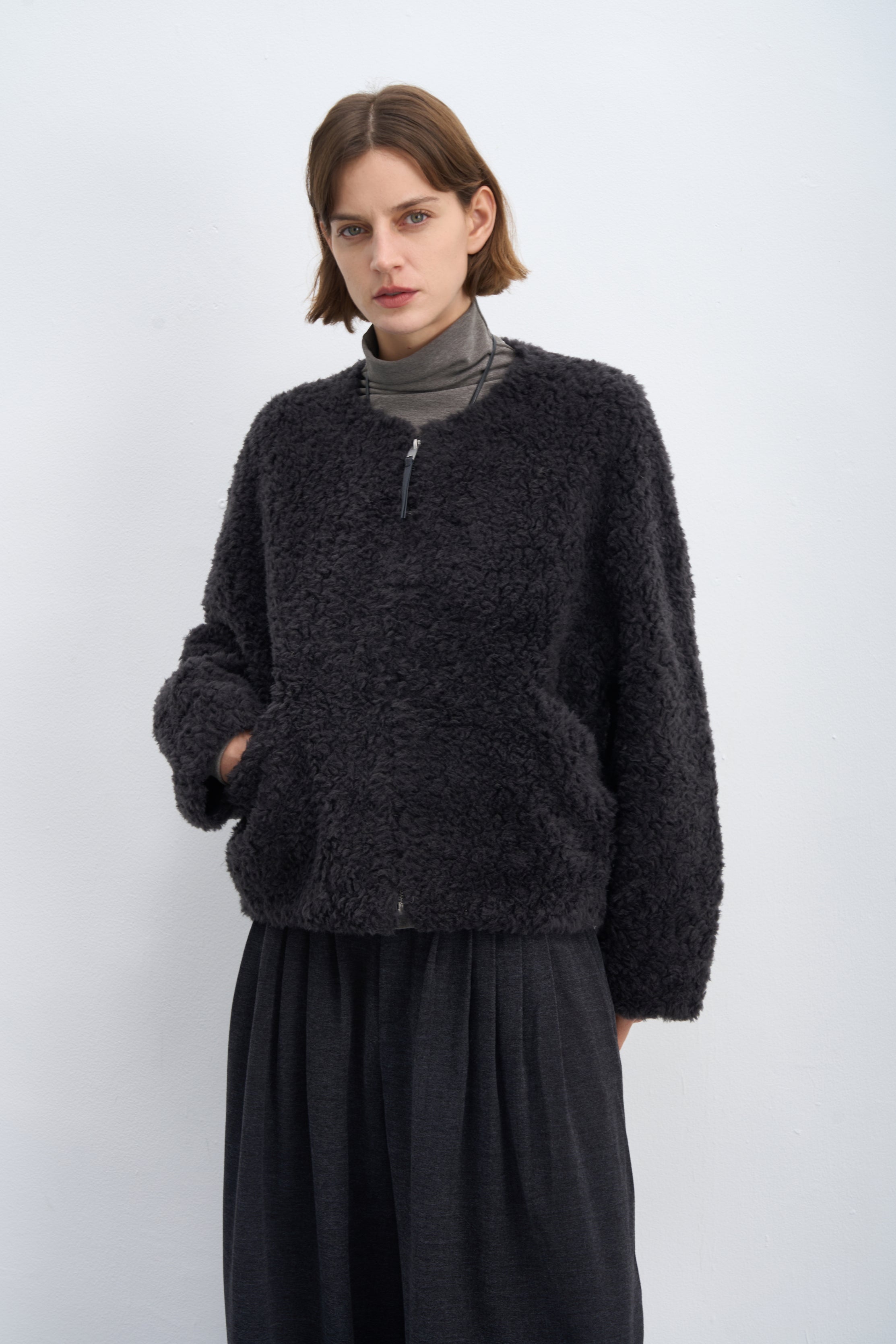 Fluffy Wool Zip-Up Crew Neck Coat