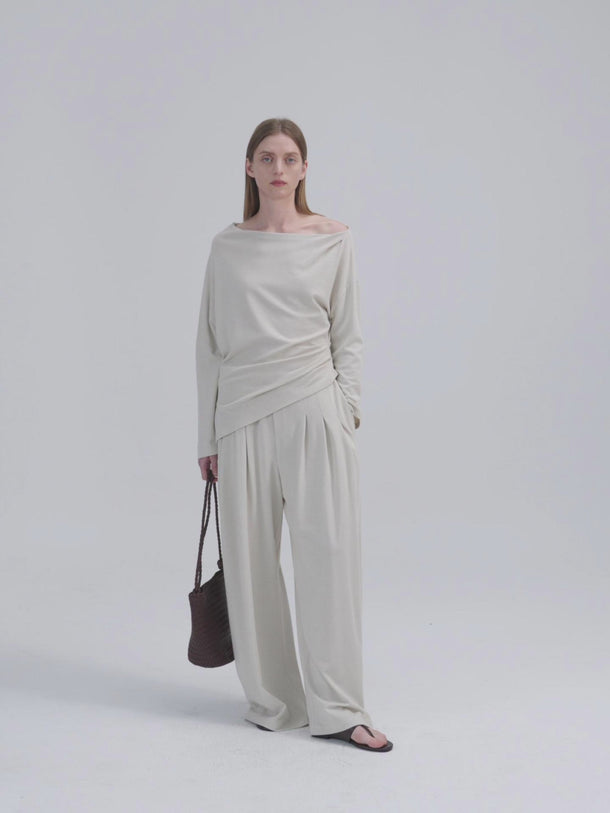 A softly draped off-shoulder knit top highlights the neckline while side pleats sculpt a relaxed, flattering waist for understated allure.