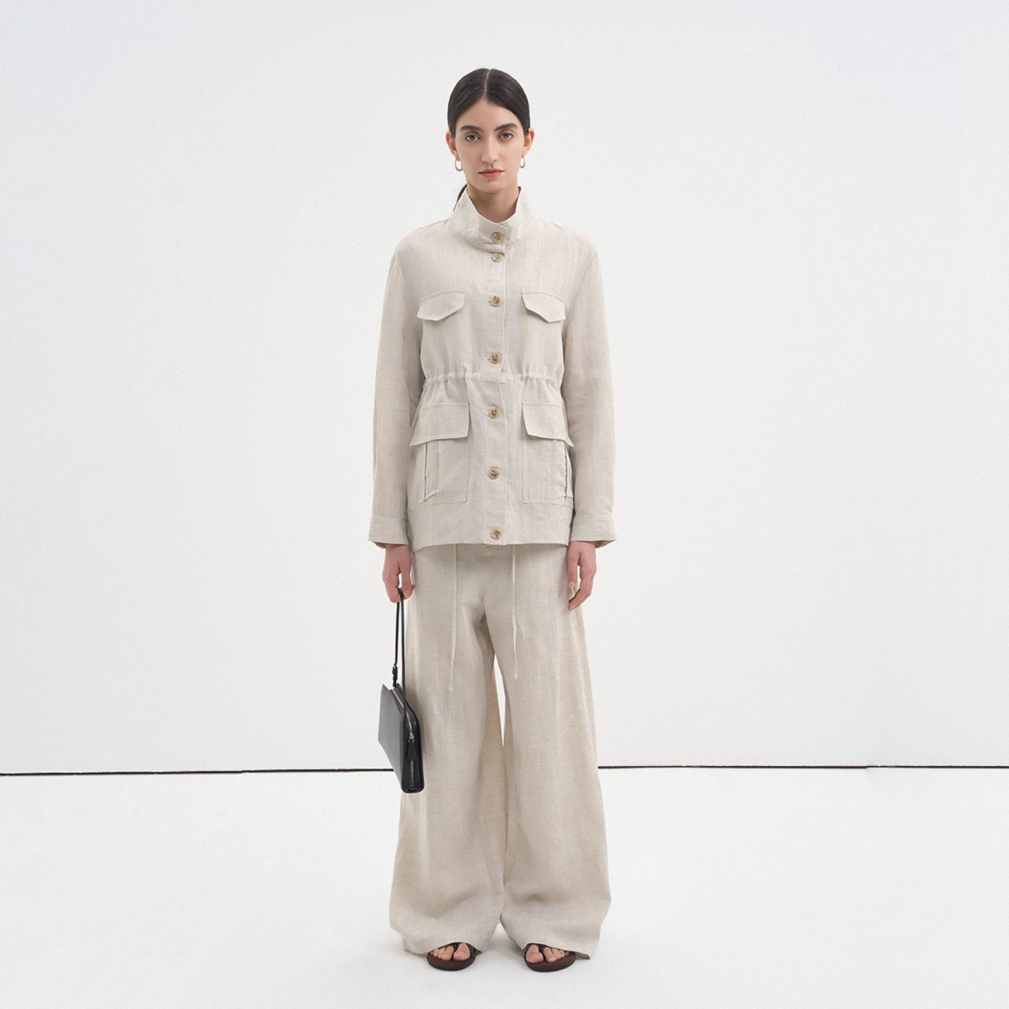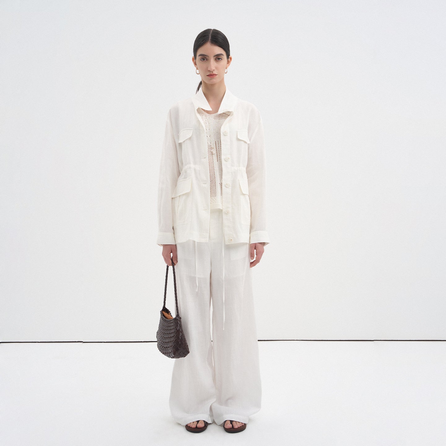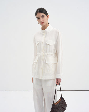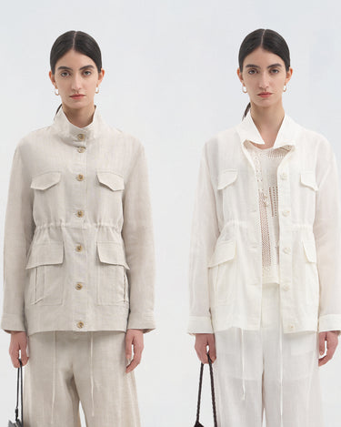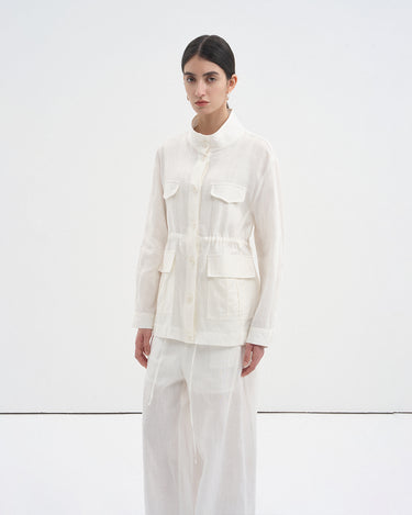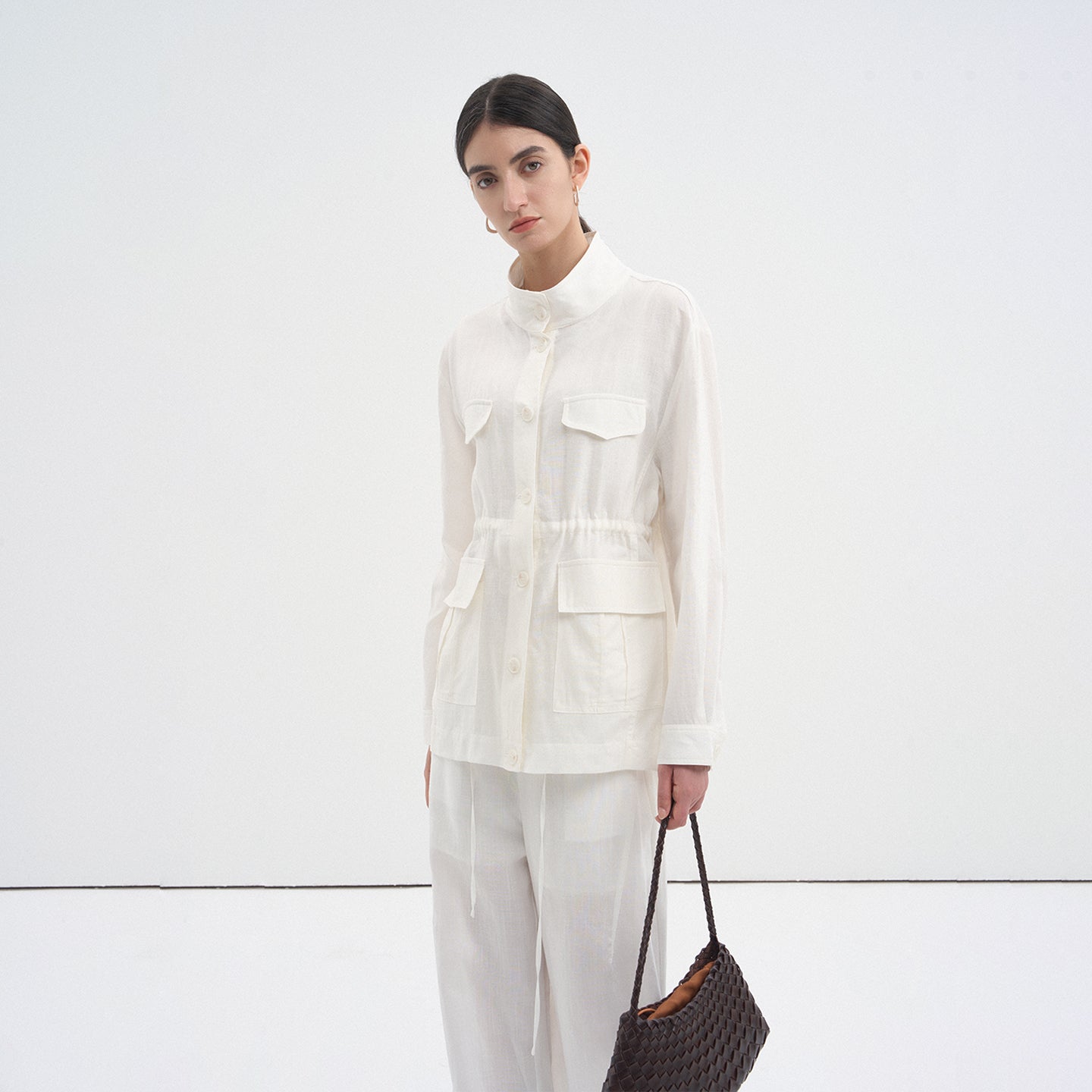 This drawstring oversized pocket shirt blends breathable linen texture with modern minimalist style. The clean stand collar and crisp white tone create a polished yet relaxed look perfect for spring and summer.