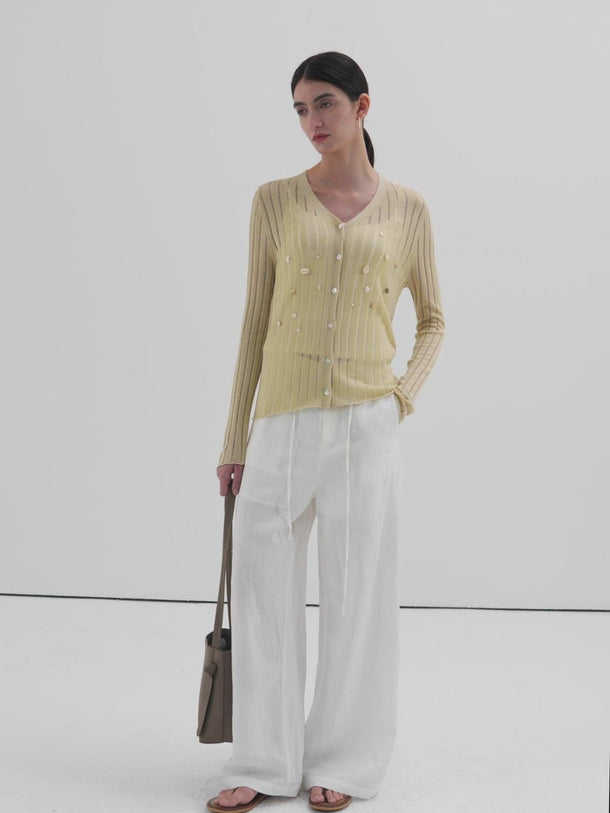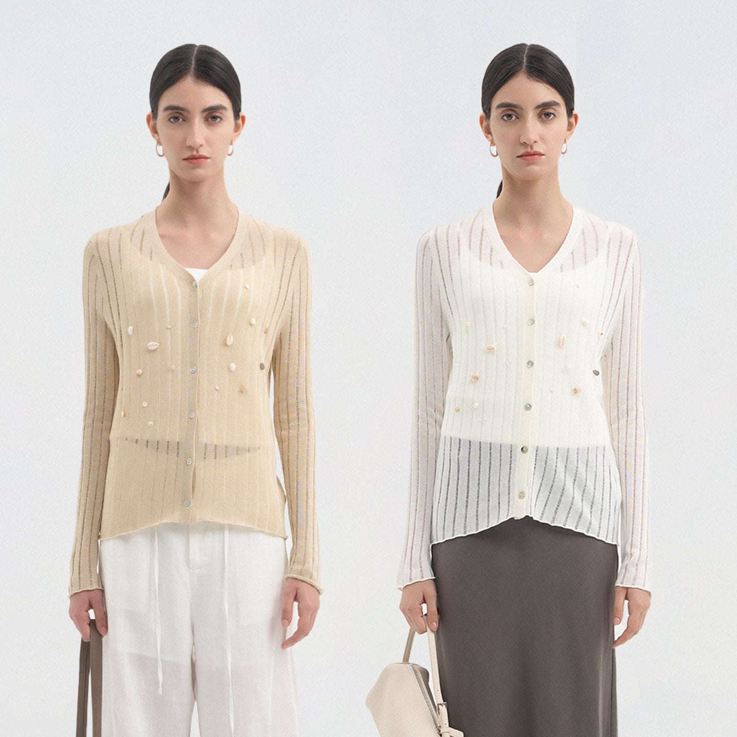 This V-neck conch shell cardigan blends serene coastal inspiration with modern minimalism. Soft gradient stripes flow naturally from body to hem, while delicate seashell and pearl accents add refined, artisanal charm.