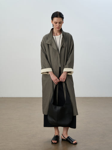 Elevate your everyday outerwear with this stand-up collar mid-length trench coat. The crisp white folded cuffs and asymmetrical placket add architectural flair, creating a sharp yet fluid silhouette. A perfect statement for city commutes or weekend gallery strolls.